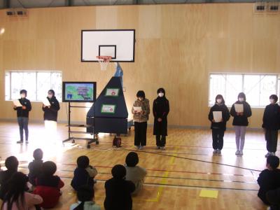 12月24日(火)4限目に6年生の紙芝居発表会が行われました。6年生の紙芝居は、松波公民館との協働授業で毎年恒例になっているものです。地域の民話を発掘し伝承していく目的で行われています。地域の方から実際に民話を聞いて、それを基に6年生が紙芝居を作成するというものです。その紙芝居を体育館に集まった全校児童の前で、方言豊かに発表することができました。