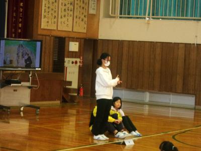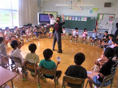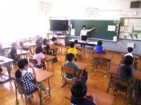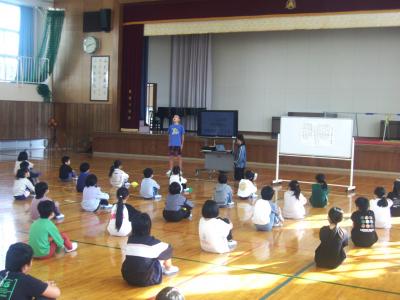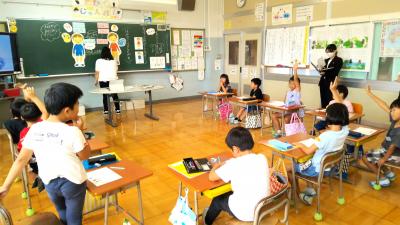 7月10日(月)です。今日は、4限目に1・2年生合同で外国語体験活動がありました。本校英語専科中谷先生とALTのエイミー先生で行いました。あいさつの仕方やその時の感情(気持ち)を表す言葉の表現について、映像やゲームを通して、わかりやすく教えてくださいました。1・2年生は、外国語活動がないので、外国語活動を体験してみようということで行われたものです。とても楽しそうでした。英語の言葉、1つでも覚えることができたかな?