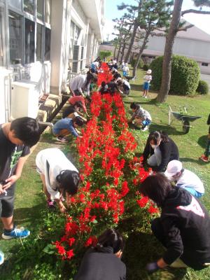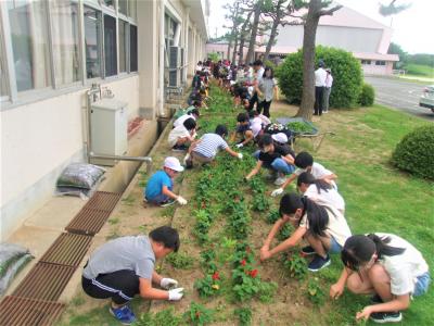 2限後のわんぱくタイムにサルビア花壇の除草作業を全校で行いました。各色グループ毎に1つ花壇を担当し、お世話をしています。全校児童が黙々と頑張っていました。6年生の優しい声かけが素敵です。みんなで頑張りとてもきれいな花壇になりました。