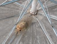 昨日、朝の交通安全指導をしていたら、子どもたちが笑顔で傘を逆に広げ、近づいて来ました。何かあるのって覗いて見ると、傘の中に羽化したてのセミが乗っていました。初めて見る真っ白いセミ。子どもたちは、短時間で色が少し濃くなっていると教えてくれました。朝から大発見でしたね!