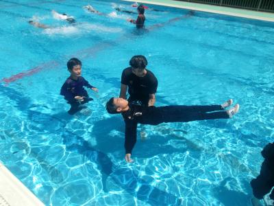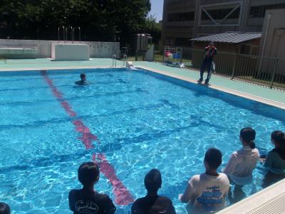 次に、プールでの実地体験です。「浮いて待て」という言葉があるように、もしも海・川に落ちた時に自分でしなければならない最善の方法「浮く」ということを体験しました。やってみるとなかなか難しいようで、ペットボトルが1本あるだけで浮き方が変わることを学びました。また、着衣したまままで泳ぐとどうなるのかということも体感しました。大変暑い中ではありましたが、休憩・給水タイムを取りながら全員が無事に学習をすることができました。