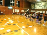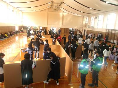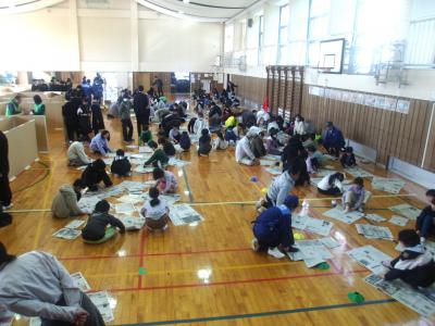 体育館には、避難してきた地域の方もいらっしゃいました。この後、松波中学校生徒も合流し、段ボールで間仕切りをつくる作業を見学し、その後地域の方を交えて、新聞紙でスリッパを作りました。地域の方に教える児童の姿もあり、とても実りのある防災避難訓練になりました。