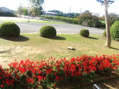 10月12日(木)です。今日は秋晴れの素晴らしい天気になりました。校長室から見えるサルビアも元気に咲いており、とても良い眺めです。