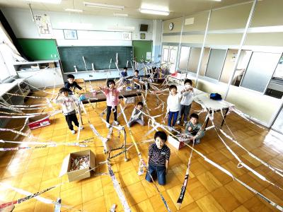 3限目に校内をまわっていると、2年生教室横のフリースペースからとても楽しそうな声が聞こえてきました。戸を開けてのぞいてみると、図工の授業「つないで つるして」の真っ最中でした。2年生はみんな笑顔で、とても楽しそうに活動していました。みんな協力して素敵な作品になりましたね。