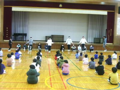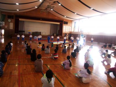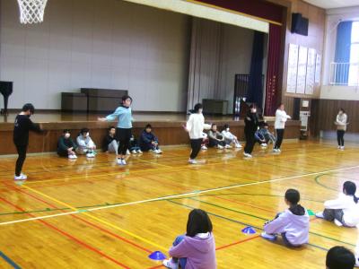 12月11日(月)の朝タイムに、6年生による縄跳び技紹介が行われました。6年生全員が、全校児童の前でそれぞれができる技を交代で紹介していました。中には、二重ハヤブサや二重交差、後二重ハヤブサ、三重跳びなど、すごい技もたくさん見せてくれました。1~5年生は、これからの縄跳びの目標ができましたね。練習をして、6年生のように上手になってください。 6年生の皆さん、ありがとうございました。