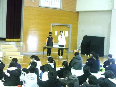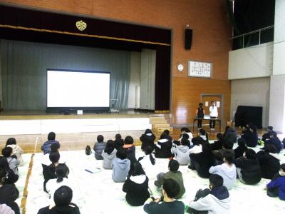 人権教室では、能登町人権擁護委員の皆様と、町役場住民課の皆様が来校され行われました。教室では、人権の大切さを人権作文朗読を聞いて学びました。また、人権擁護委員の皆様から子供たちへ人権グッズをいただきました。