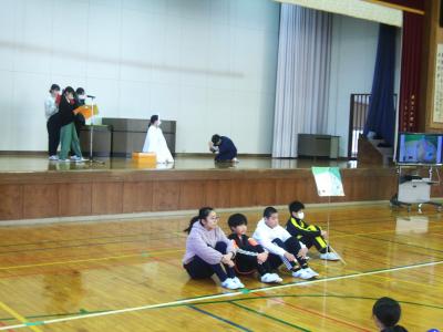 12月8日(金)です。早いもので2学期もあと10日となりました。今日の朝タイムに児童集会が開かれ、6年生の発表がありました。6年生は、松波公民館の皆様のご協力をいただき、地元に伝わる民話の紙芝居を作成しています。その成果を、先日の松波公民館祭りでも発表してきました。今日は、その紙芝居発表を更にバージョンアップして全校に発表してくれました。紙芝居の題名は、「おとらの長持ち」です。紙芝居の朗読、寸劇に加え、今回朗読の台詞を全編手話通訳を行う試みを行いました。舞台の下で6年生が場面毎に順番で手話を行いました。早い台詞に対応した手話で見ている方も驚くばかりです。本当に素晴らしい発表をしてくれました!6年生ありがとうございました。また、感想発表も素晴らしかったです。学年が上がるごとに、感想が長くなり、自分の想いをしっかりと表現できていました。松波小学校では、言語活動を重視しており、全校集会・児童集会など行事も学習の場ととらえ、一人一人が相手意識をもち発表を行っています。各学年の感想発表もより具体的に話をする伝統が受け継がれています。