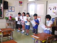1限目に1年生が音読発表会を行いました。題材は、大きなかぶでした。しっかりとめあてを確認したあと音読が始まりました。おじいさ役の児童がかぶを植え、大きく育ってきました。1人じゃなかなかぬけません・・・・。とお話は展開していきます。子どもたちは、演技を入れながら大きな声をだしていました。抑揚も身振り手振り、声の大きさもバッチリでした。