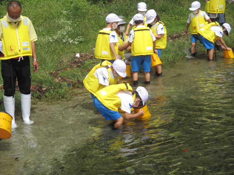 子どもたちは大きな水中ゴーグルを使い、小さな魚や小エビ、カニなど様々な生き物を見つけていました。中には、観察に夢中になりズボンが濡れてしまった子もいました