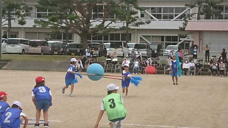 次は,低学年の団体競技「落としちゃダメよ 大玉運び!」です。