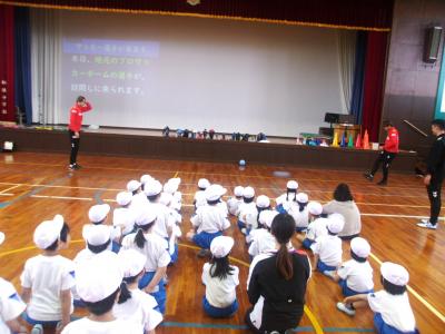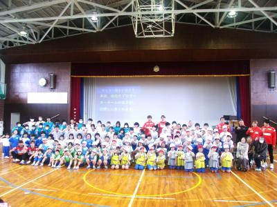 5月13日(月)の5・6限目に松波小学校・中学校にJ3リーグで戦っているツエーゲン金沢の選手が来てくれました。5限目には、1~3年生、6限目は、4~6年生が選手たちと準備運動から選手対小学生のゲームをしてくださいました。本物のサッカー選手のパスやシュートを見せてもらい、あまりのボールの速さに驚き、リフティングもとても上手でした。子どもたちは、選手とふれあいながらとても楽しい時間を過ごすことができました。また、避難されている皆様と選手がストレッチや談笑するコーナーもあり、避難されている皆様も楽しい時間になったようです。ツエーゲン金沢の皆様、本当にありがとうございました。