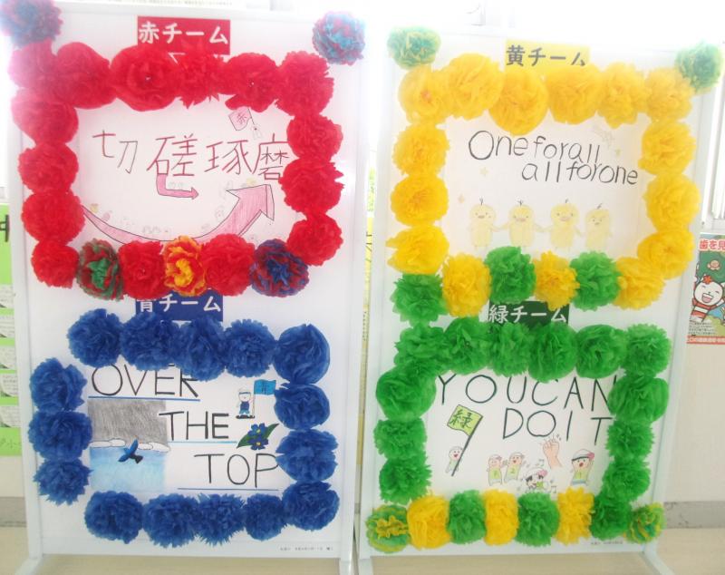 本日、明日の運動会で披露される、各色チームのスローガンパネルが完成しました。6年生が丁寧に飾り付けをしてくれて、素晴らしいパネルです。運動会にかける6年生の思いが伝わってくるようです。