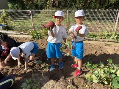 10月25日に1年生が旧校舎の畑に植えたサツマイモを収穫してきました。一生懸命掘っていると出てくる出てくるサツマイモに1年生は大歓声でした。たくさんとれましたね。1年生頑張りました!