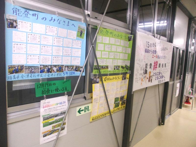 実はこの掲示は、福島県会津若松市立小金井小学校5年生の皆さんから届いた、心温まるメッセージです。小金井小学校の皆さんは、体験学習で育てたお米を、能登町の小学校へ届けてくださいました。その際に添えられていた素敵なメッセージを、現在廊下に掲示しています。