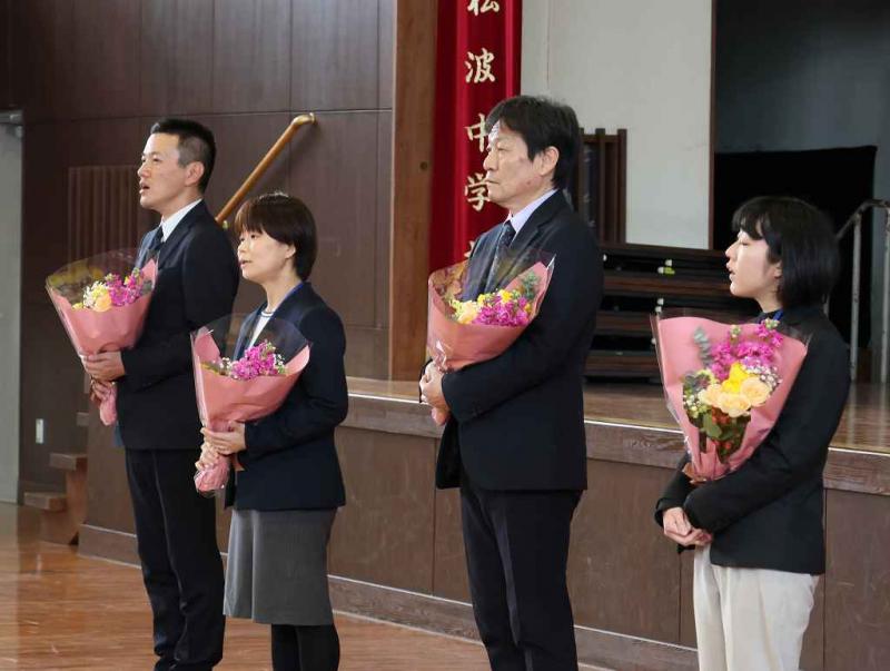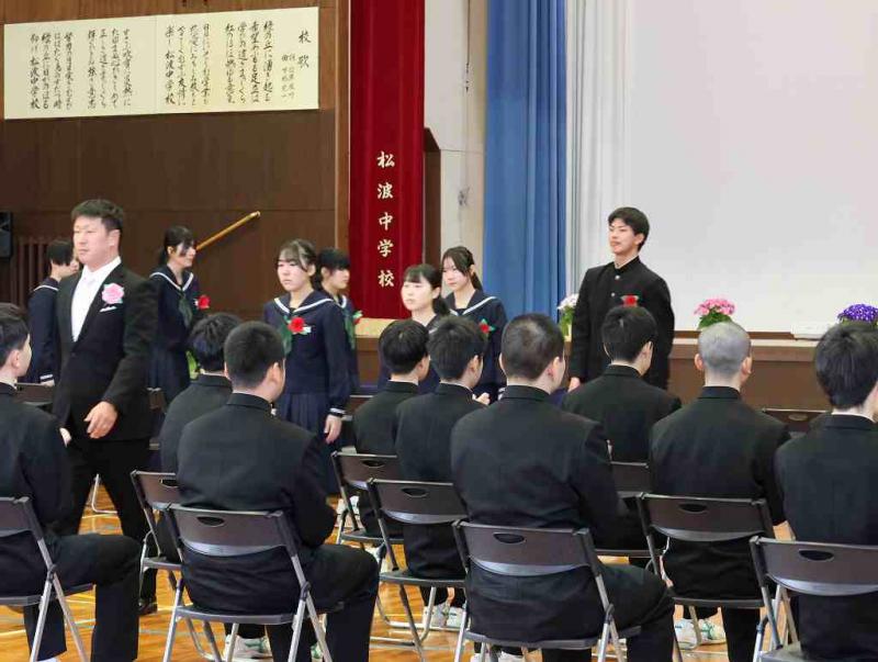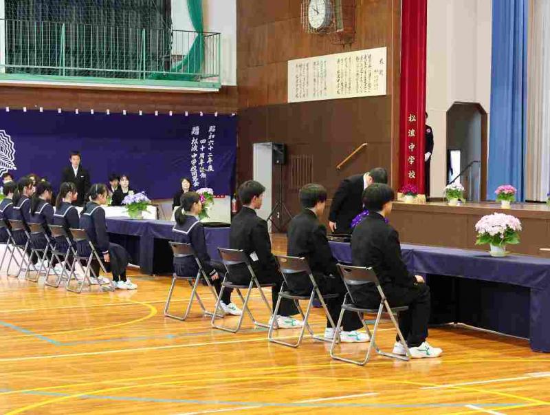 松波小学校では、地域に伝わるお話を探究し紙芝居を制作して表現する活動をしています。松波中学校の1年生から3年生の松波小卒業生が、当時制作した紙芝居が製本され、お話ボランティア「ひまわり」の皆さんから読み聞かせをしていただきました。「願成寺のお厨子の龍」「おとらの長持ち」「浜谷七郎兵衛物語」3話とも、とても上手につくられており、じっくりと聞くことができました。また、生徒たちは自分が描いた絵が紹介され、どきどきわくわくしながら聞いていたようです。