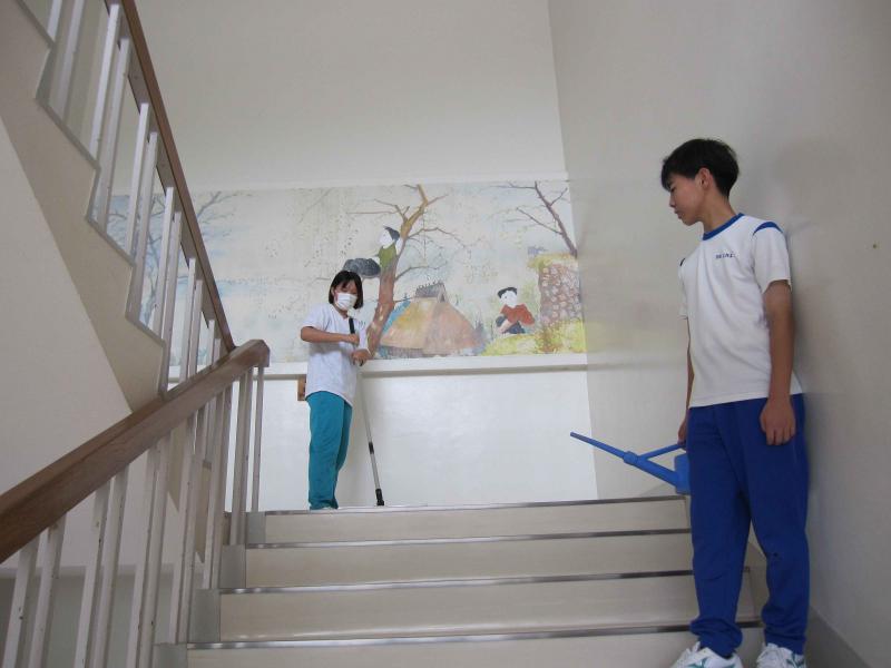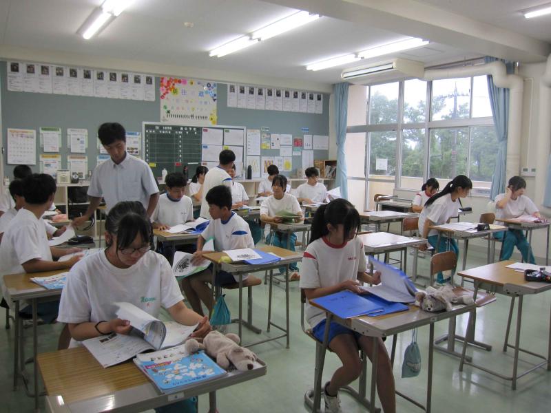 昼休み、生徒たちはそれぞれの場所で友達と過ごしています。学習室では、来週に実施するバス遠足(能登町生徒提案型学校生活充実化事業)のバス内でのレクレーションについて、生徒会のメンバーが話し合いを進めていました。何をするかは、当日までのお楽しみ。盛り上がるレクを期待してます!また、体育館では、バドミントンやドッヂボールで運動する様子もありました。体を動かして、午後からの授業に向けて脳も活性化されるといいです。職員室に戻る時、図書室から本を借りてきた生徒と出会いました。