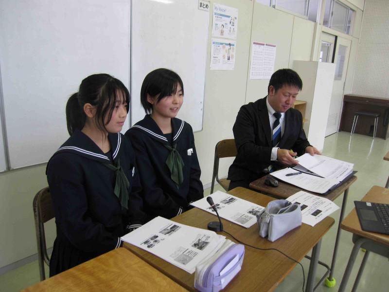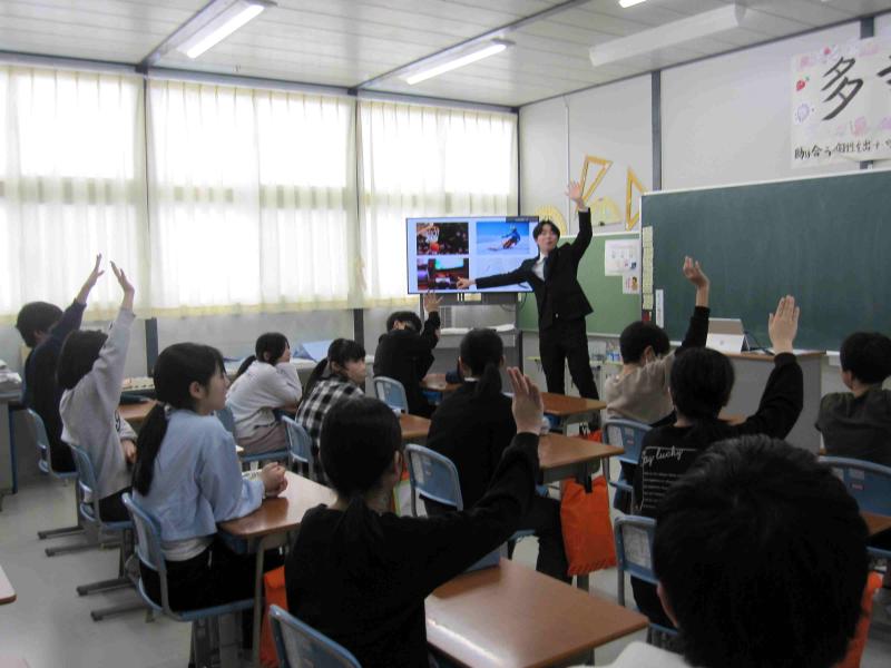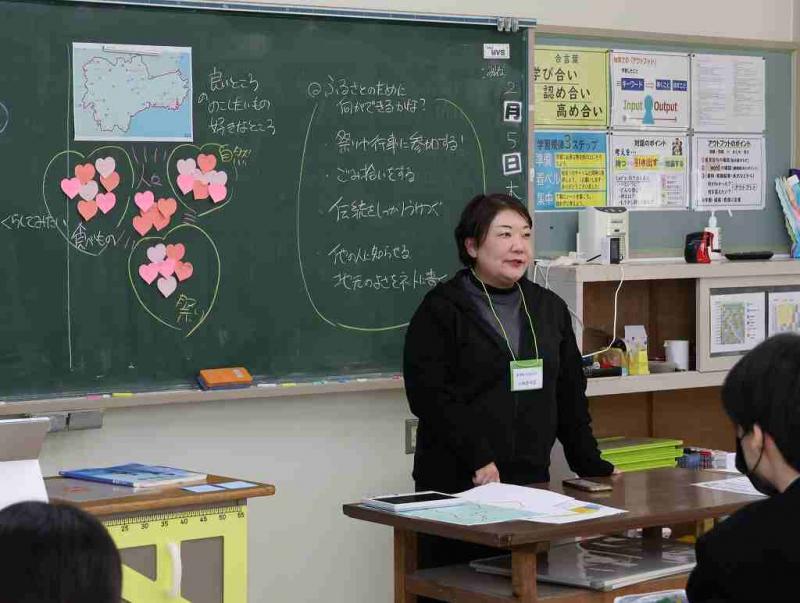 1年生の道徳の授業で「未来のふるさとを考えるために」をテーマに自分が大人になった時のふるさとのことを思い、今の自分ができることを考えました。ゲストティーチャーに、震災後も家業を続けられている松波酒造の金七聖子さんを招き、「能登で仕事をする良さやそれに対する思い」、「中学生へのメッセージ」を話していただきました。生徒からは「能登の良さを伝えていきたい。」「一度は離れるかもしれないけど、また戻りたい。」など、一人一人が未来の自分とふるさとを考える機会になりました。