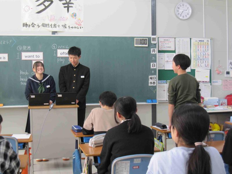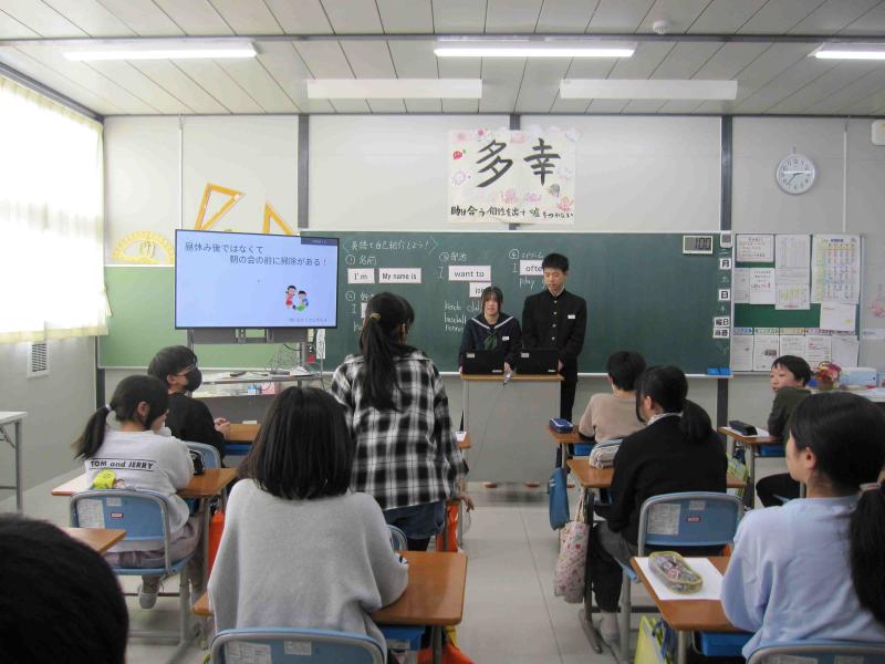 松波小学校6年生の皆さんと授業体験などを行いました。授業体験は「英語」です。積極的に英語での自己紹介に挑戦していました。また、生徒会会長と副会長から「中学校生活」について、クイズを交えながら伝えました。児童の皆さんからたくさん質問があり、中学校生活への興味関心が高いことが嬉しかったです。その後、中学校校舎に移動し、各学年の授業を参観しました。見られる中学生の方が緊張していたように思いました。