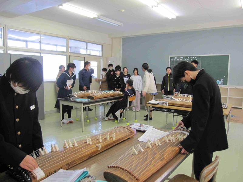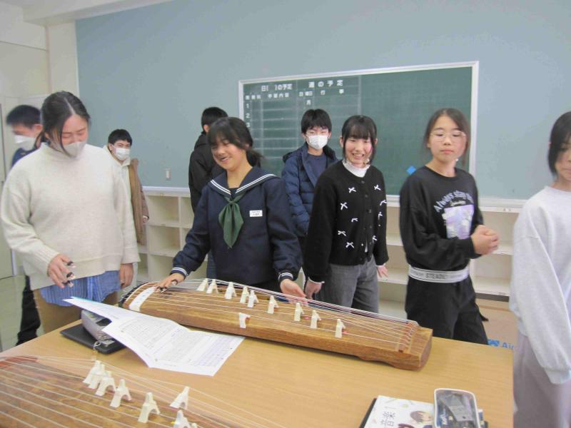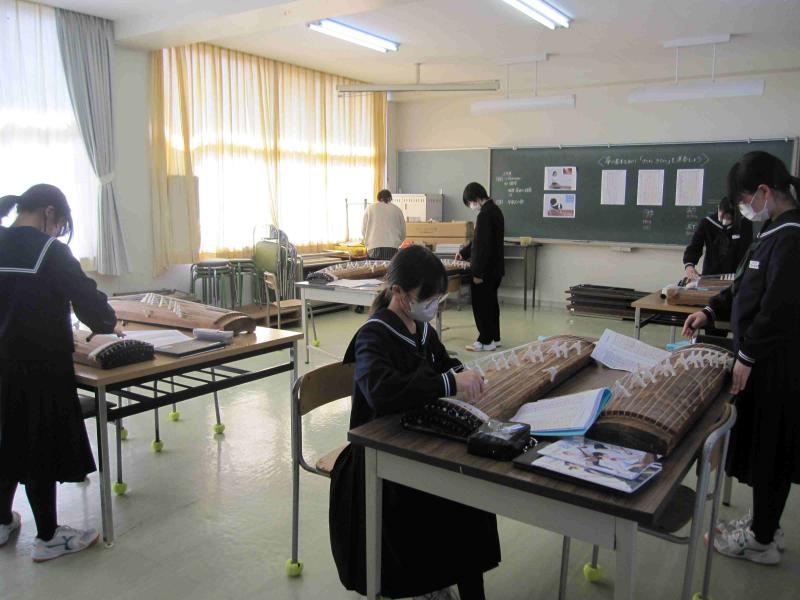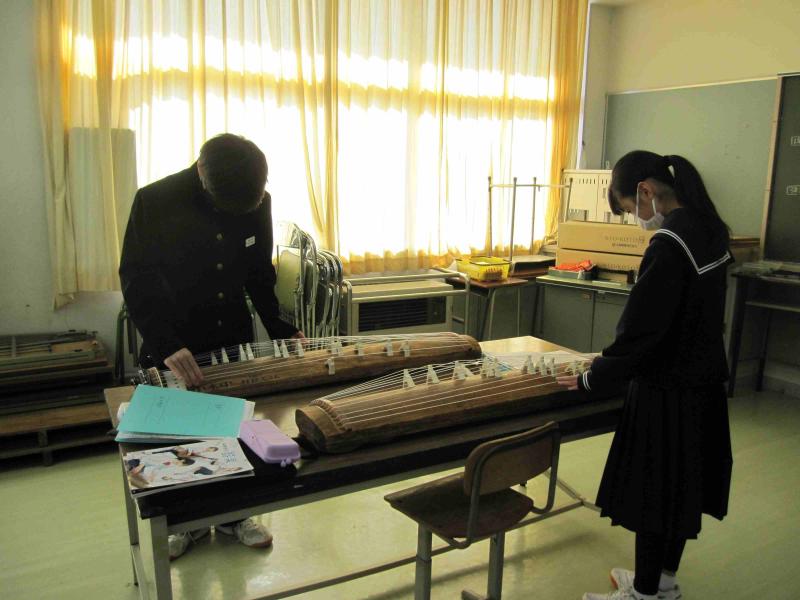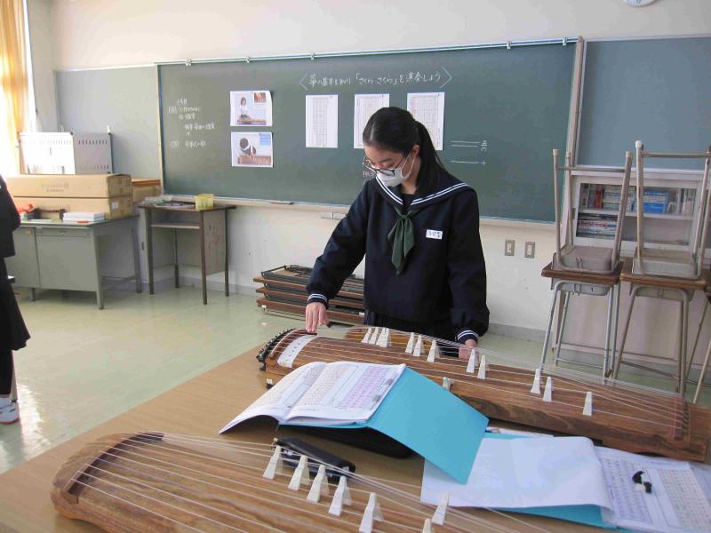3学期、音楽の時間に箏の音色が響いています。1年生が「箏曲の特徴を感じ取って,その魅力を味わおう」を題材に、箏曲の鑑賞や演奏について学んでいます。昨年度、地震後の支援でコンパクトな形の「ネオ箏」を購入させていただきました。専用の箏爪をつけて「さくらさくら」を交代で演奏練習をしています。弦をはじく力が強く必要なのですが、生徒はしっかりと弾き、暗譜して演奏できるようになっている生徒もいます。また、3年生は1年生時に地震があり、この学習ができませんでした。そこで、3年生も卒業式の歌の練習と合わせて箏の練習にも取り組んでおり、真剣そのものです。「箏の音色」に癒されています。