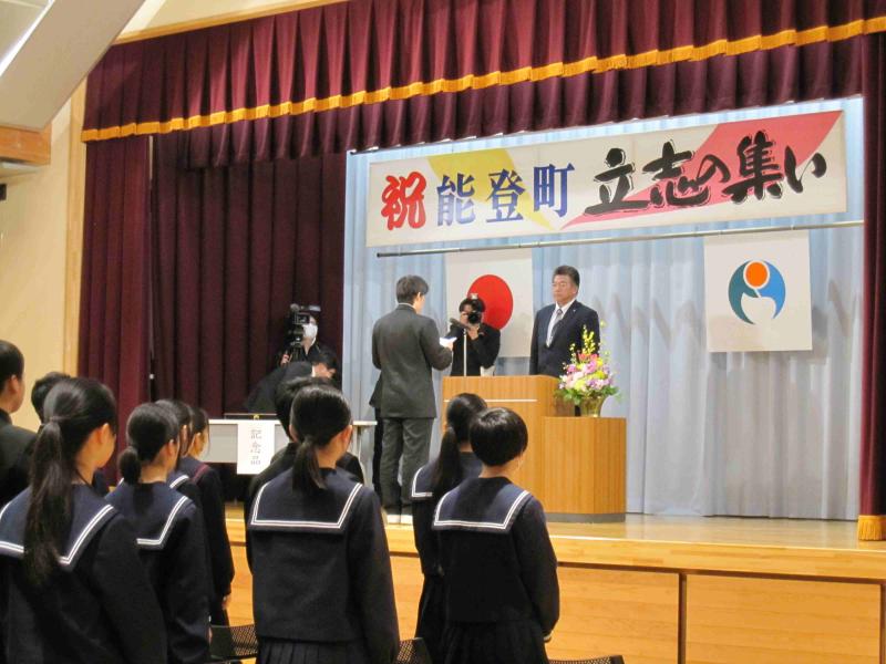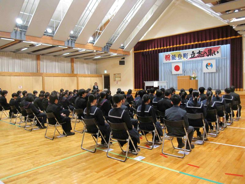 能登町「立志の集い」が開催され、2年生が式典に参列しました。能登町立中学校2年生を代表し、本校の濵本悠希さんが「誓いの言葉」を力強く述べ、「次の時代を担う立派な人間になることをめざして歩んでいく」ことを吉田町長に伝えました。その後、経営者でありインフルエンサーとして活躍しておられる釜谷正宏様から「社会に出る前の今」と題して講演をしていただきました。「社会性偏差値」を高めることや、「チャレンジ(行動)すること」が成長につながることなど、たくさんのメッセージをもらいました。
