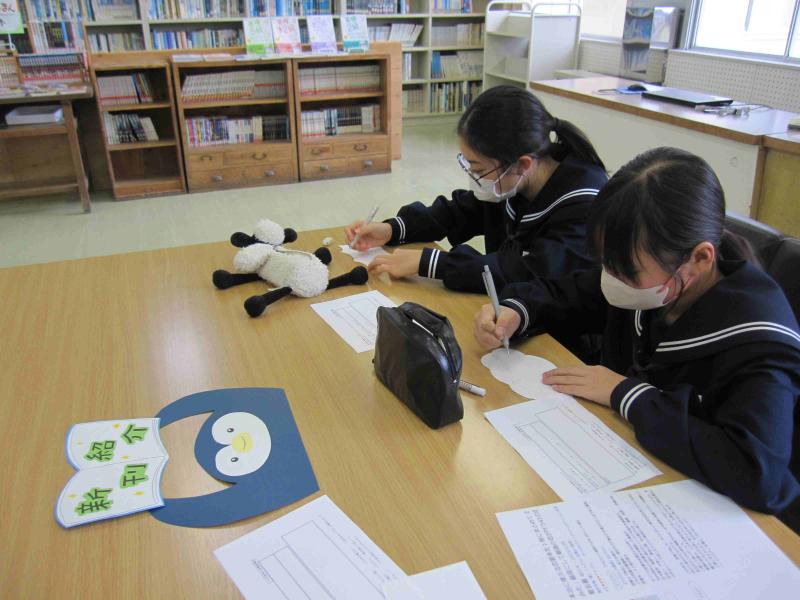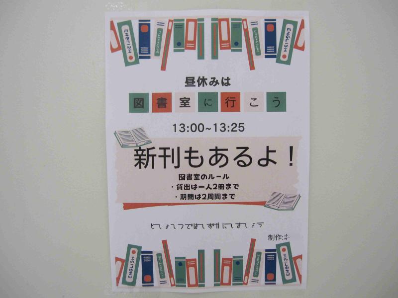 生徒の読書活動を支援する団体様からたくさんの本を寄付していただきました。生徒がリクエストした本が届き、図書・文化委員会では、委員会報告の際に新しい本の紹介をしました。また、読書活動推進として、ポスターを作成して掲示したり本のポップを書いて表示したりしています。少しずつですが、昼休みに図書室に来る生徒が増えてきました。