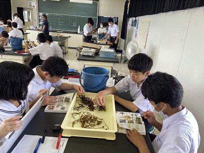 2年生は総合的な学習の時間で赤崎海岸に行きました。海洋教育の一環として海藻採取を行い、理科室で同定と標本作りを行いました。