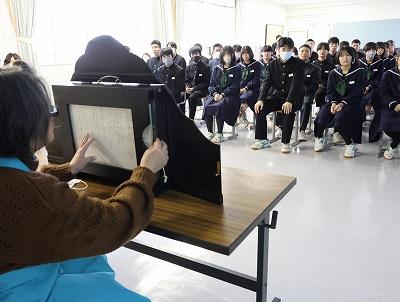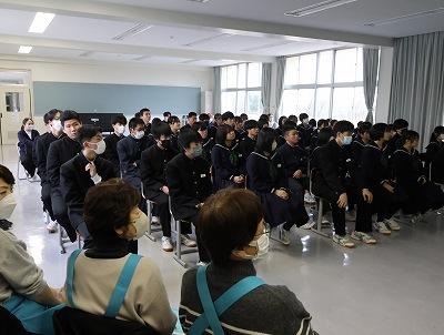 本日、6限目に「アーティストによる、教育プロジェクト~子どもたちに本物を~」をテーマに、ピアニストのスティーブン スモールさんとヴァイオリニストの鹿嶋 静さん、能登町に拠点を置き、支援活動をされている岩城 ひろこさんをお招きし、演奏とキャリアトークをしていただきました。生の演奏を聞く機会が少ないので、まずその音色の美しさに感動しました。また、鹿嶋さんのヴァイオリンを貸していただき、希望者が演奏体験をしました。音楽で気持ちが安らいだ後は、プロの音楽家になった道のりや「夢をかなえるために大事なこと」などについてお話を聞きました。あっという間の50分間でした!ありがとうございました。