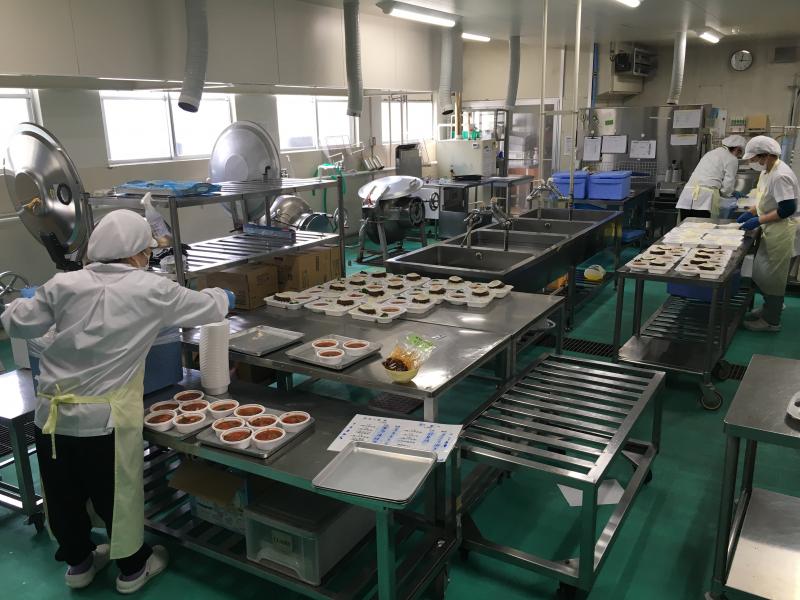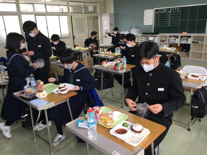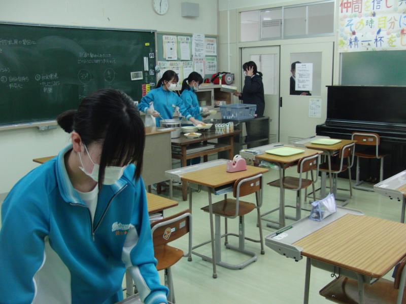 本日のお昼は、3年生最後の給食です。炊き出しでお世話になった「北陸チャリティーレストラン」のシェフの皆さんが、卒業お祝い給食を作ってくださり学校まで届けて下さり、給食室で配膳しました。