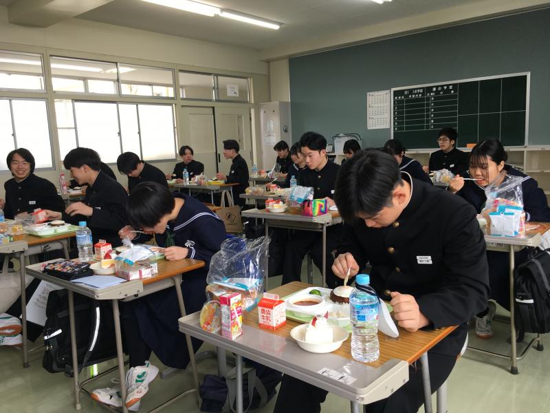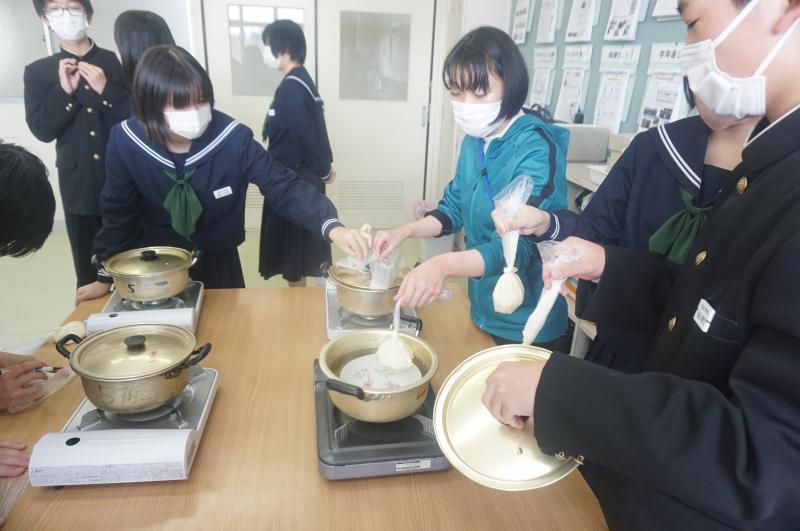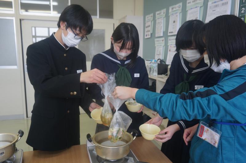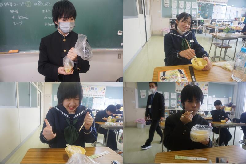 またまた食の話題です。1年生家庭の授業で、中学生もできる防災食づくりに挑戦しました。調理室を入浴支援の自衛隊に貸し出しているため、実習は教室で、コンロを避難所からお借りしました。メニューは「蒸しパン」と「野菜スープ」です。「おいしい!!」と自画自賛、とても好評のようでした。なるべく水を使わない(食器を洗わない)工夫も。防災食に限らず、一人暮らしを始めても野菜をとれる大人になってくれれば・・・とは、家庭科担当教諭のつぶやきでした。