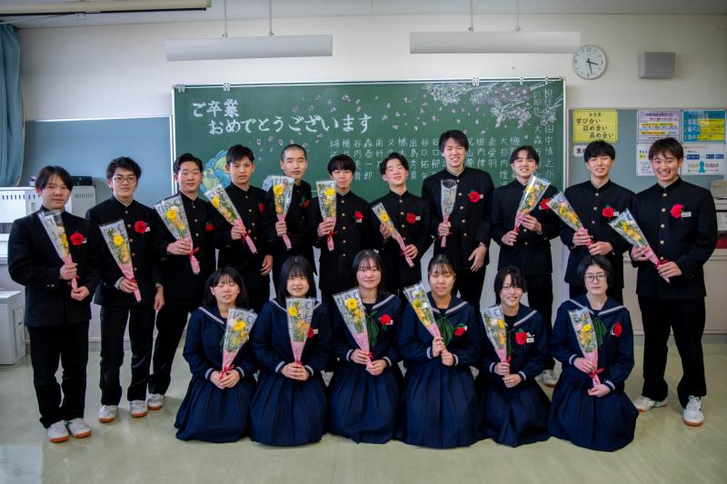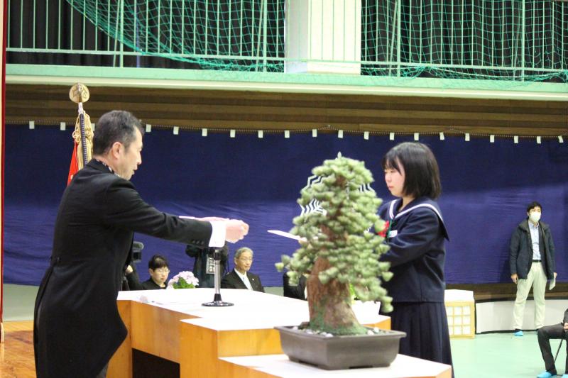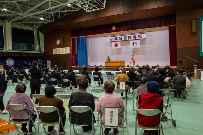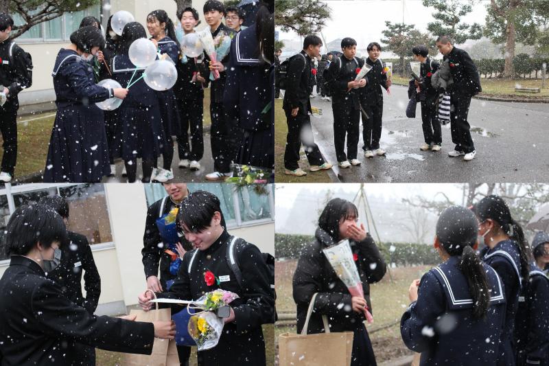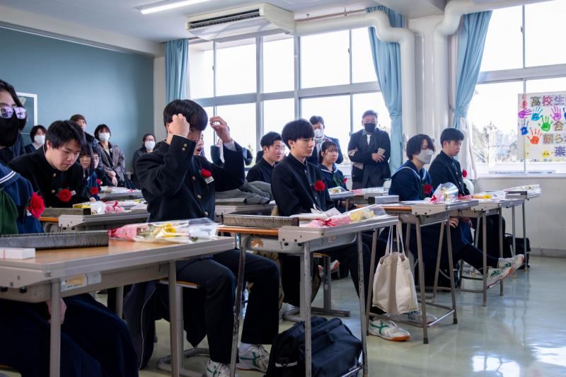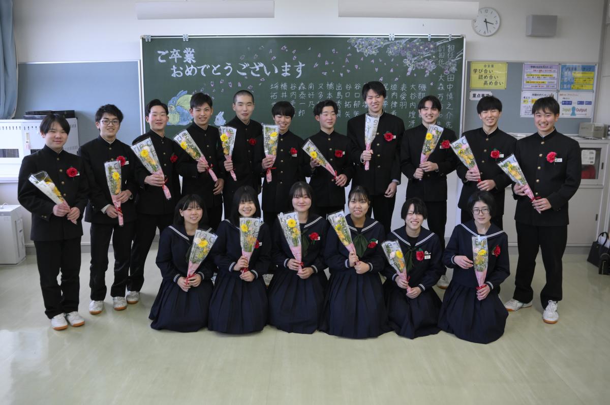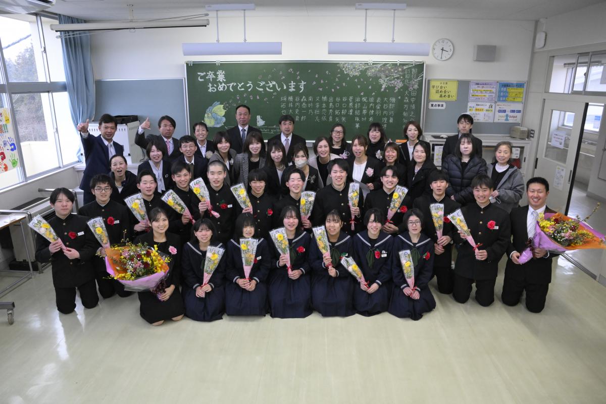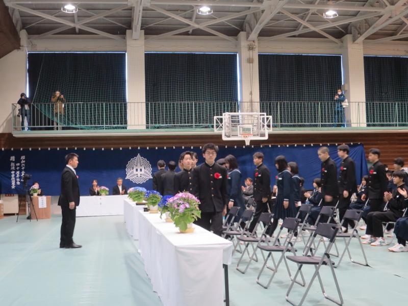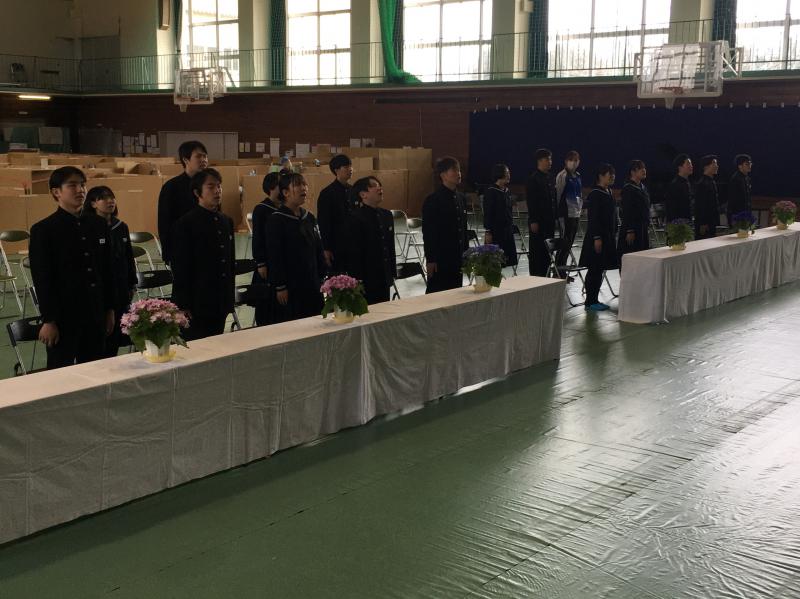 また、今回は避難者の皆様にもご参列いただきました。本校出身の方も多く、校歌や在校生の歌を一緒に歌っていただいたとのことでした。地域の方にご来校いただいて学校行事に参加・参観していただくことは、学校経営方針の一つです。今回は地震という思わぬ形での実現でした。今後はもっと積極的に広報していきたいと思います。また、卒業生に花束を贈っていただきました、ありがとうございます!