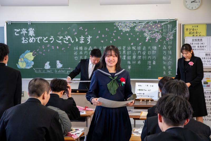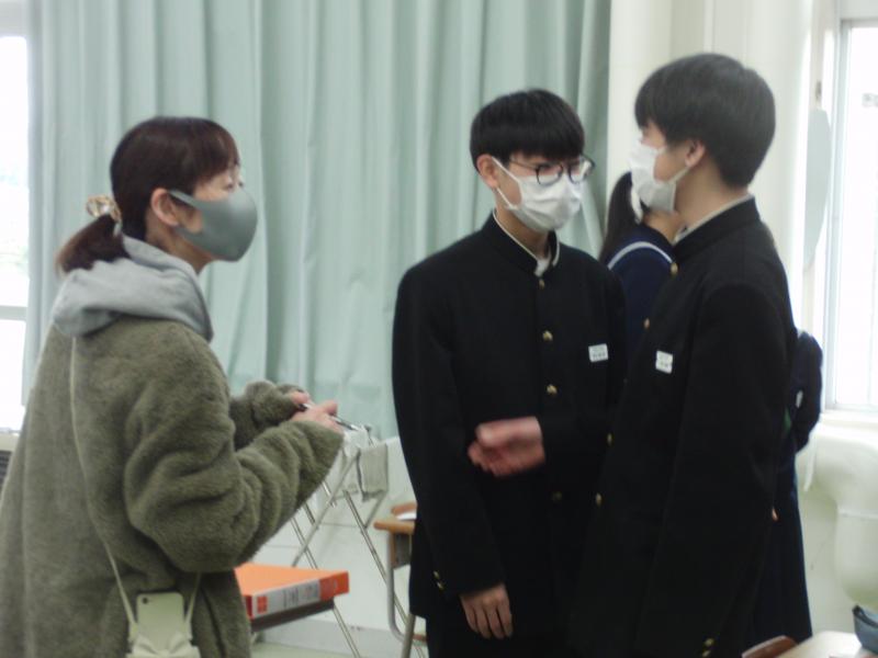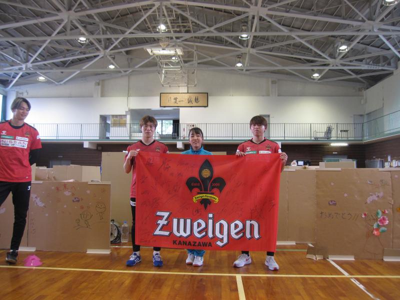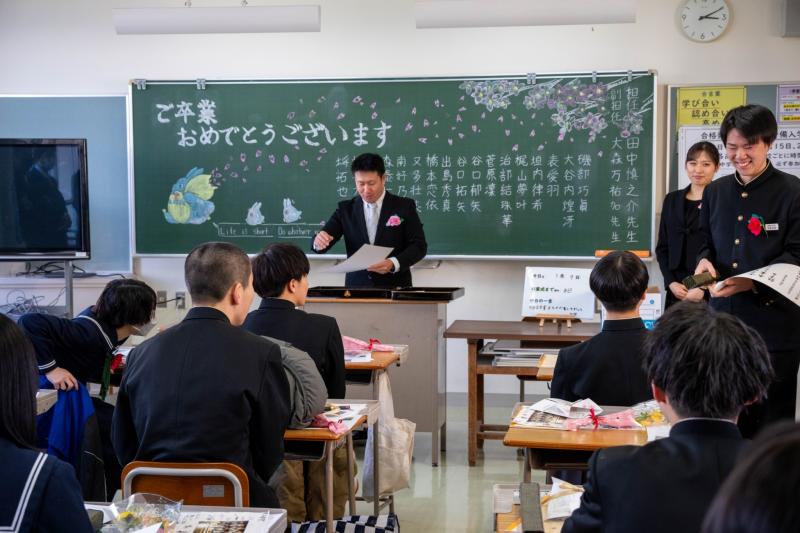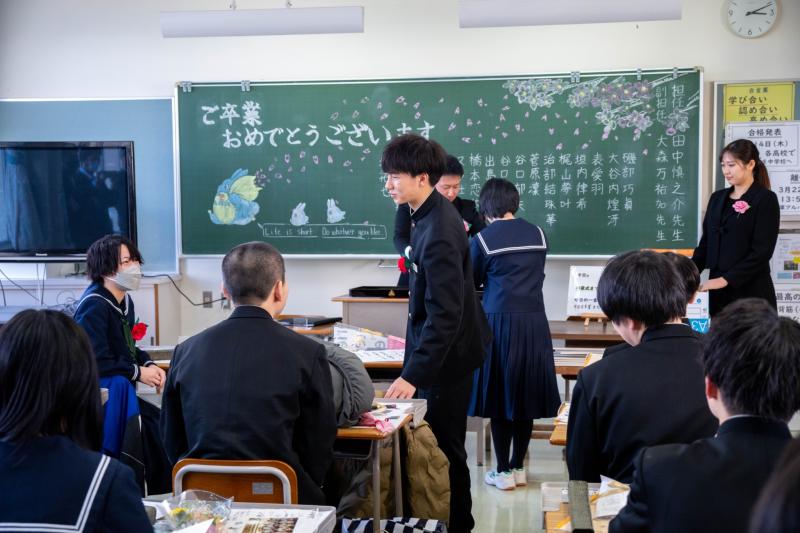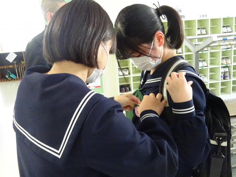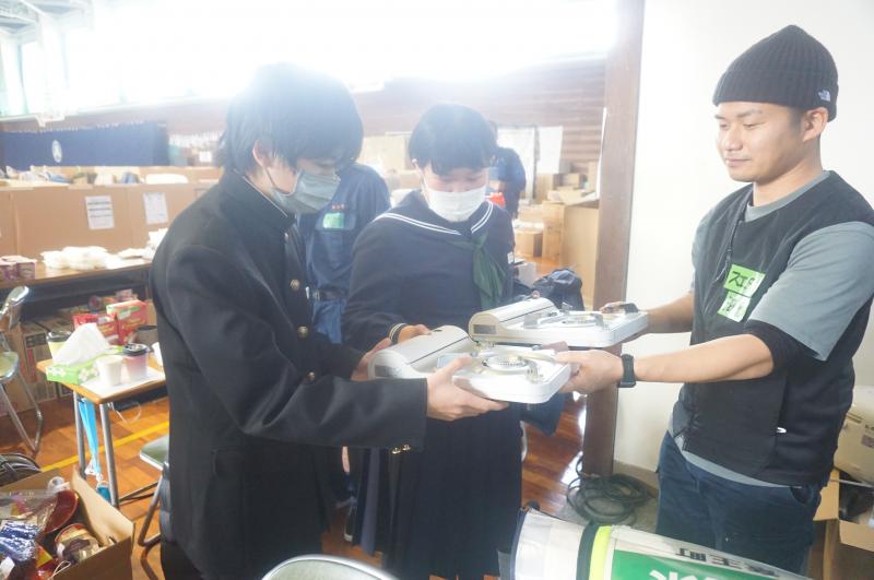 生徒が手にしているのは、体育館に避難されている方からの卒業生への贈り物です。