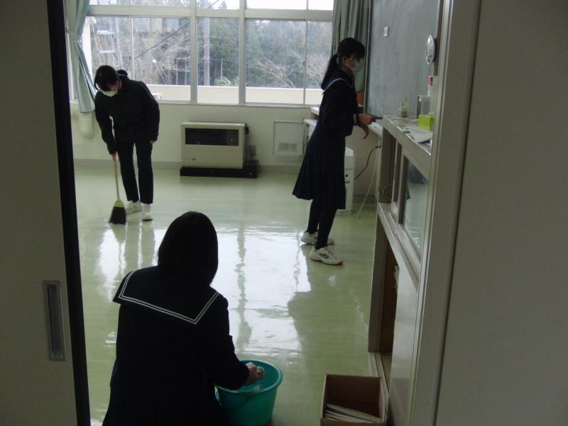 昨晩からの雪が地面を覆っていますが、朝には日が差してきました。現在は朝の学活前に掃除をしています。3年生が卒業し、少ない人数で手分けして校舎をきれいにしています。