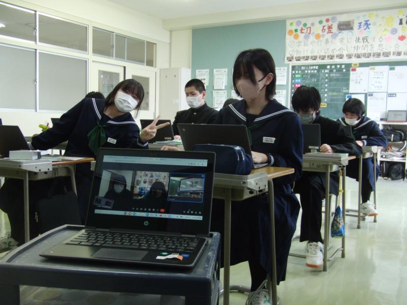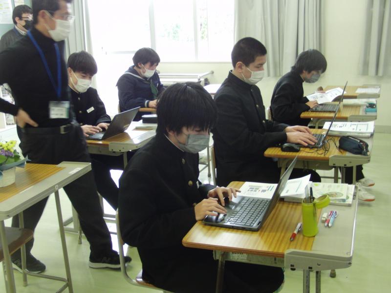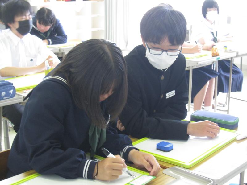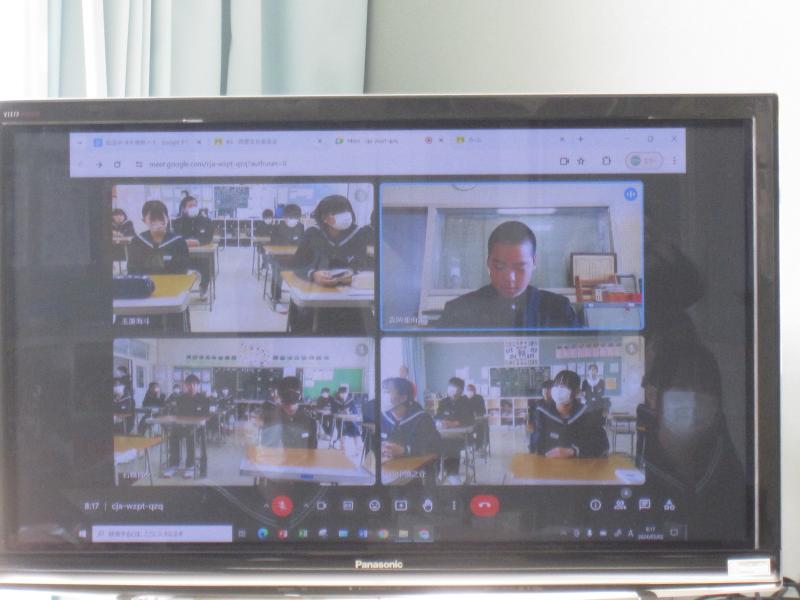 1年生は技術、プログラミング学習です。「ねそプロ」というソフトウェアを利用し、SNSのソフトつくりをしました。自分なりに作ってみたソフトで、友達やAIとの会話に挑戦しました。オンラインで参加している生徒もSNSソフトを完成させました。すごい・・・。