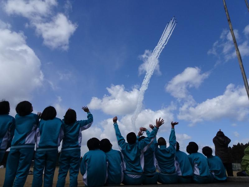 本日、航空自衛隊のアクトバット飛行チーム「ブルーインパルス」が松波中学校の上空を飛行しました。奥能登を元気づけるために志賀町・和輪島市・能登町を飛行してくれたそうです。昨日、悪天候で中止になった分、今日の観客たちの期待は大きかったように思います。