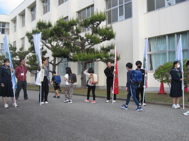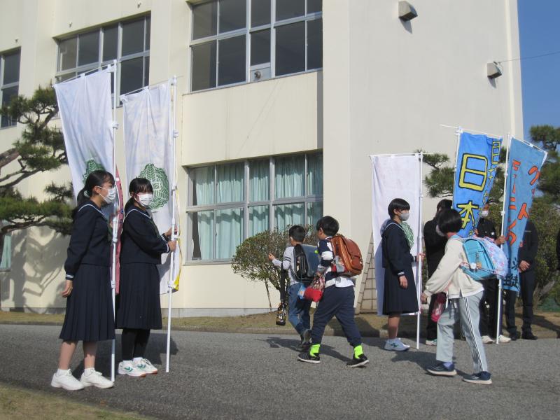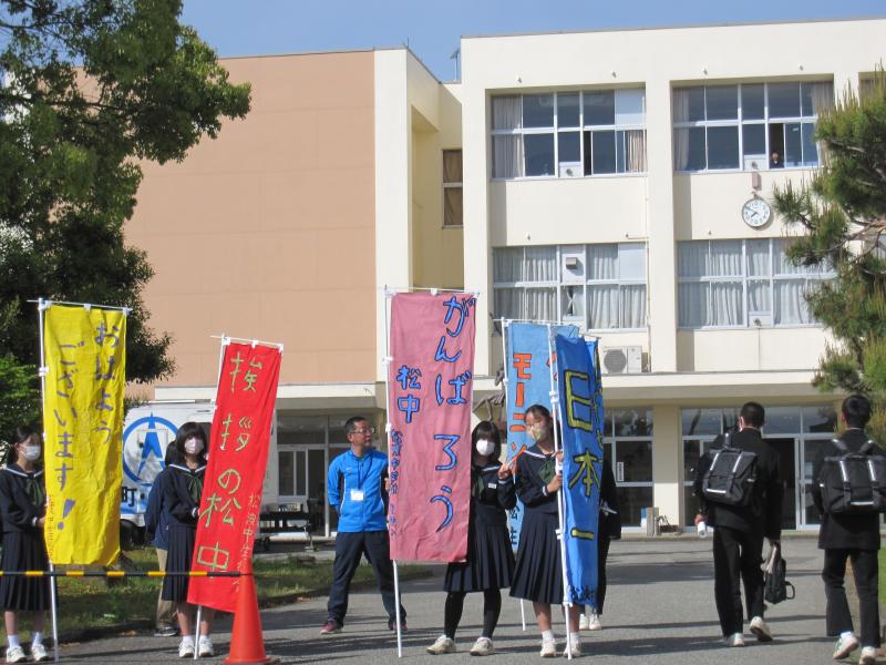今日から1週間「グッドマナーキャンペーン」を実施します。今朝は、生徒と教職員、保護者の方や地域の方々の協力で、学校前の交差点や校門前で、気持ちのよい挨拶の声が響いていました。中学生はもちろん、仮設校舎へ向かう小学生の皆さんも、とっても元気な挨拶をしてくれます。