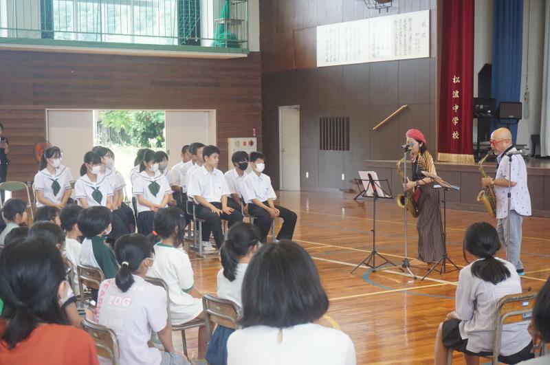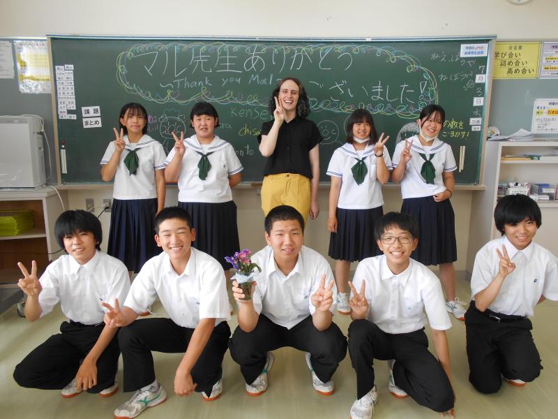 終業式後に、松波小中学校で5年間、外国語を一緒に勉強して下さったマル先生のお別れ会を行いました。生徒たちはマル先生との授業をとても楽しみにしており、今日が最後の授業だった1年生・3年生は大変盛り上がっていました。それぞれの学年から色紙と花束のプレゼントを贈り、代表生徒は英語でメッセージを伝えました。