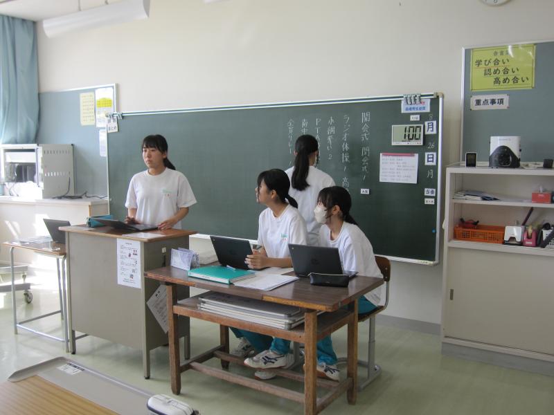 先日の委員会で決定した活動内容を、全校にお知らせしました。生徒会長や委員長は、しっかりと伝えていました。