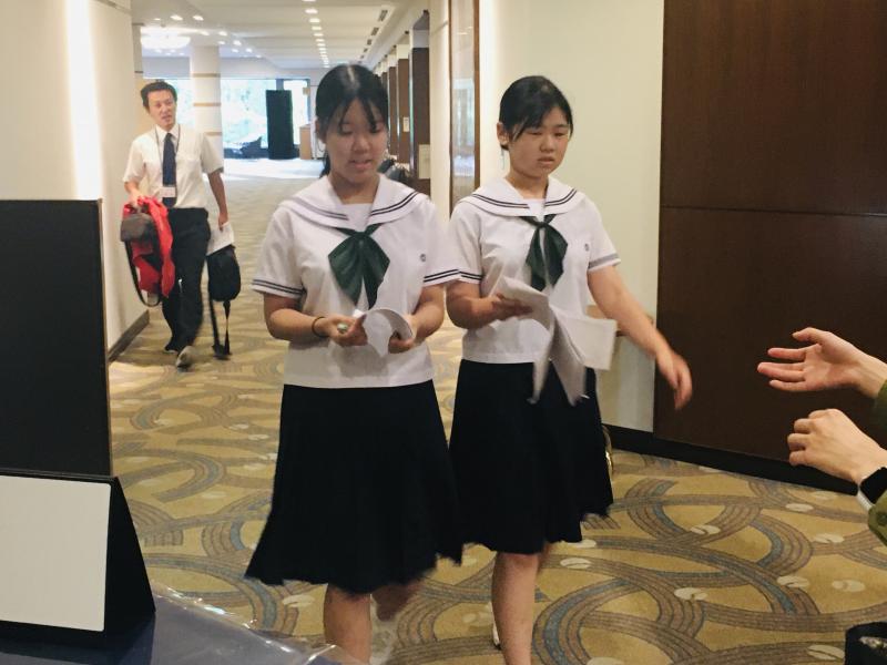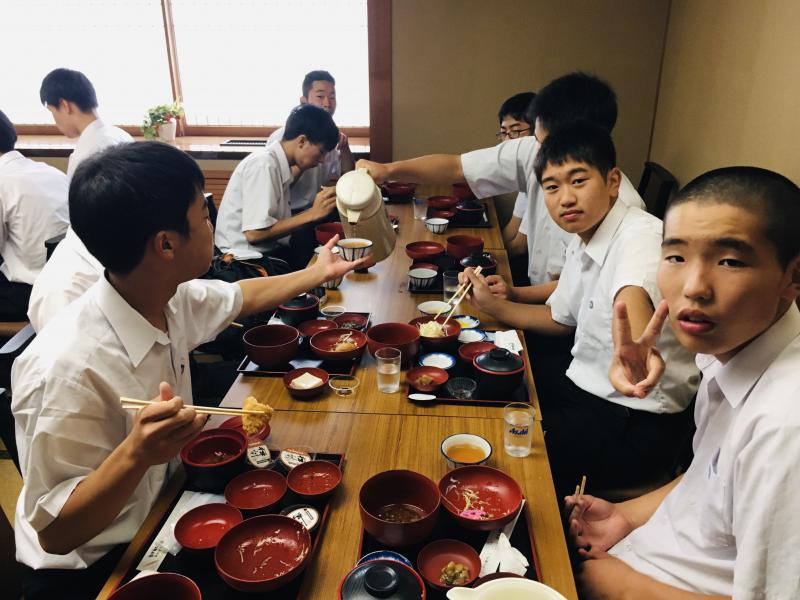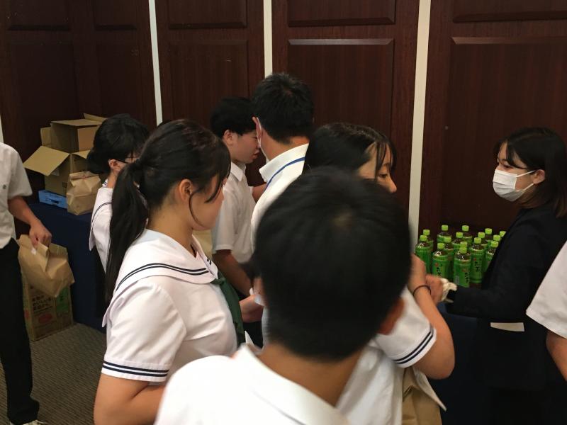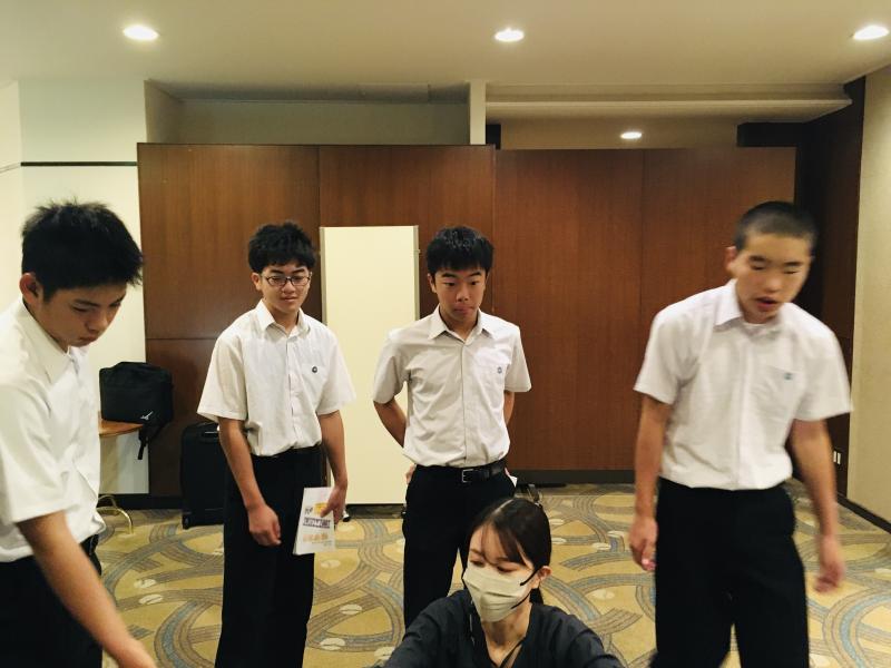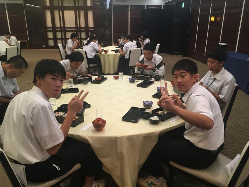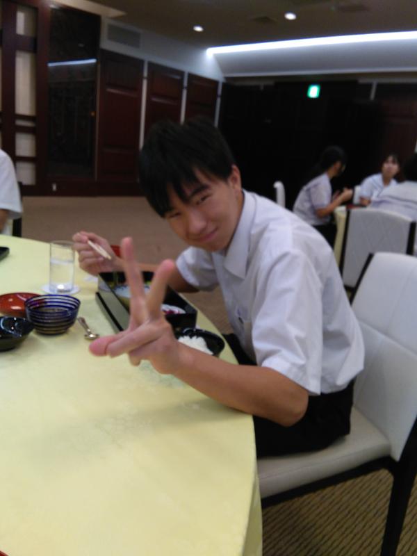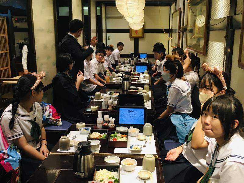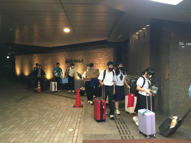 修学旅行初日も無事終了しました。コインランドリーからの洗濯物を配って就寝です。写真はマナーをご指導いただいた笠原さんへのご挨拶と、夕食後おやつ袋とお茶をもらって食事会場を出る様子です。