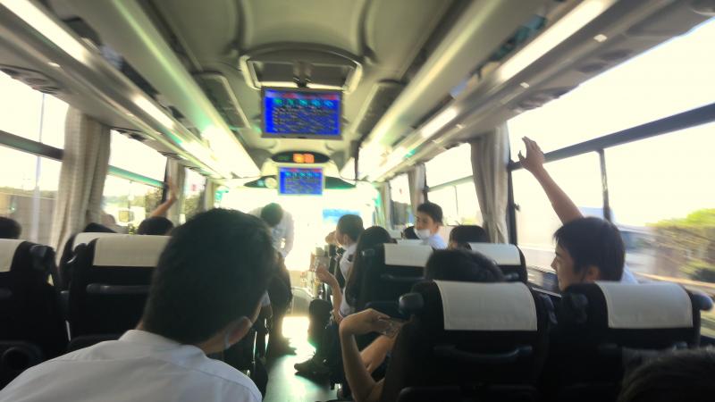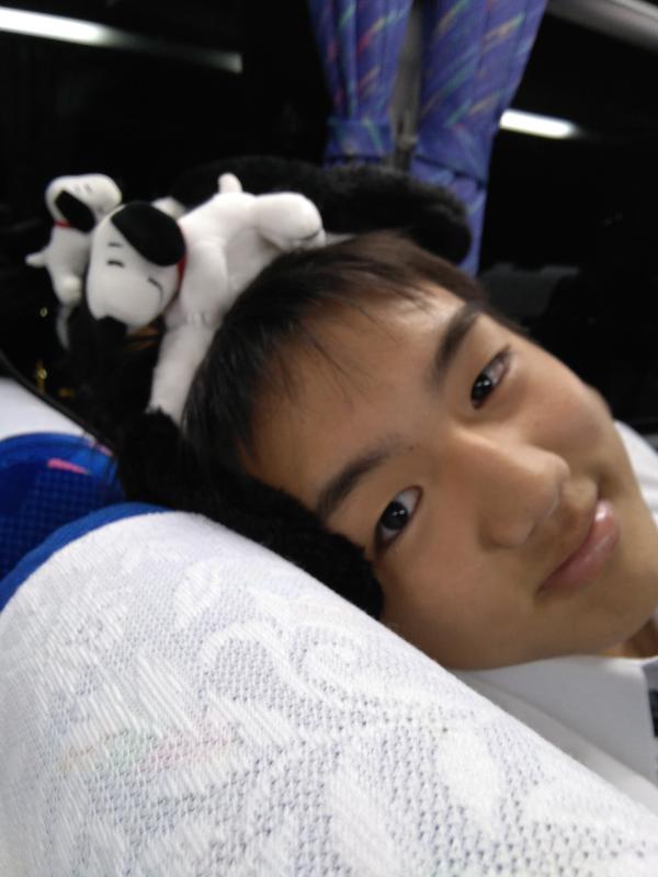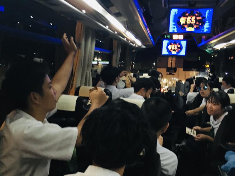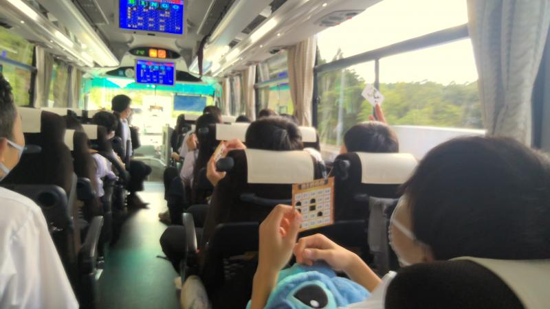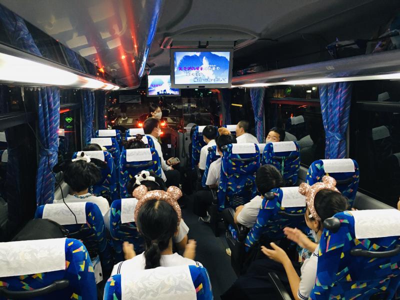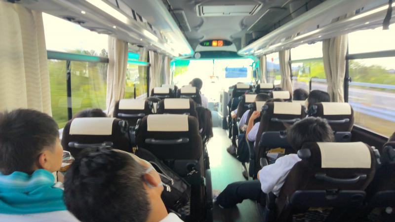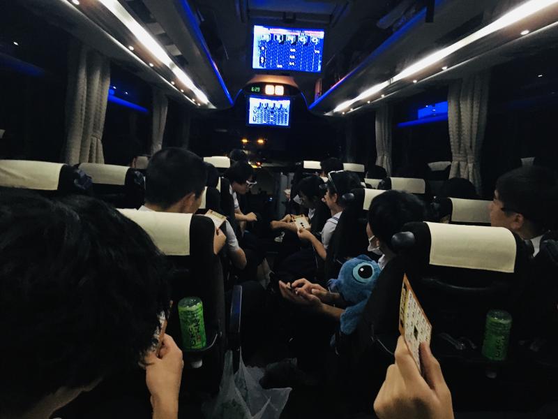 京都の宿へ向けて大阪を出ました。カラオケ大会が始まりました。シラフのはずですが、すごい盛り上がりです。結構上手いです。中学生、侮れません。