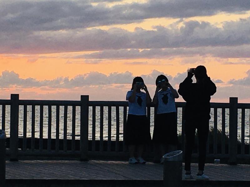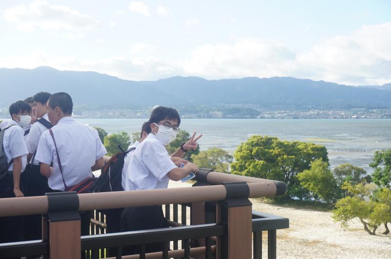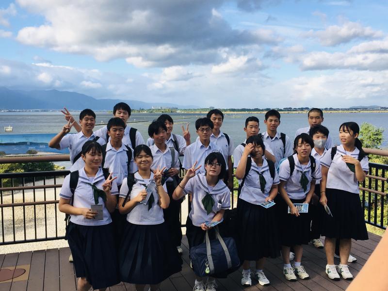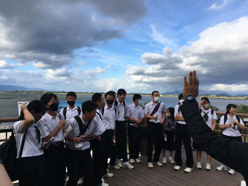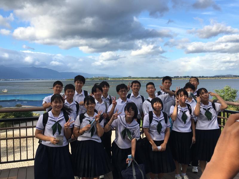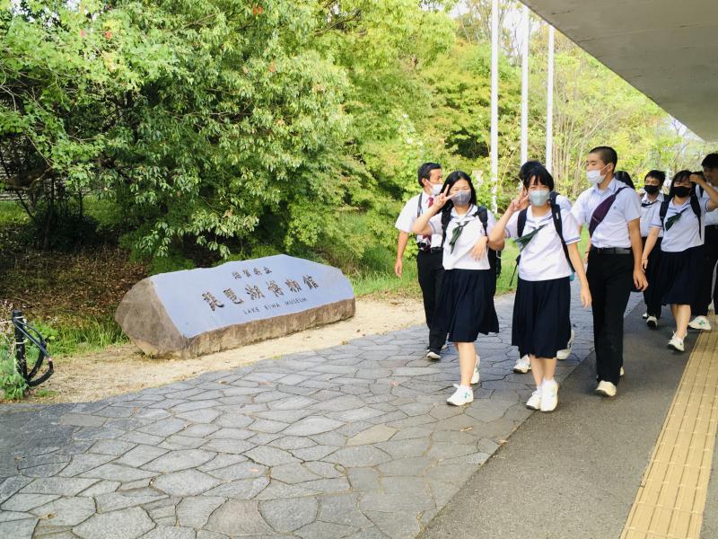 次の写真は、博物館到着前の様子です。「海じゃないんけ」「あの辺魚おりそう」などなど琵琶湖の感想が飛び交いました。