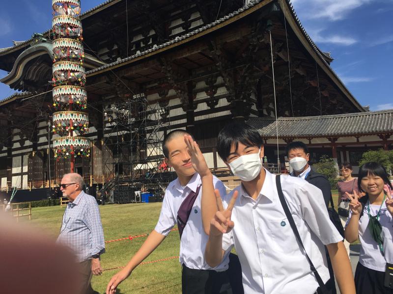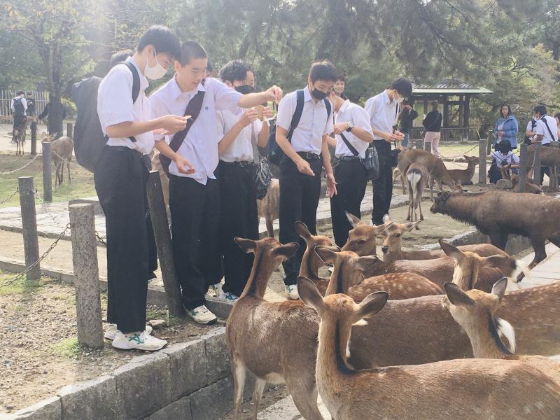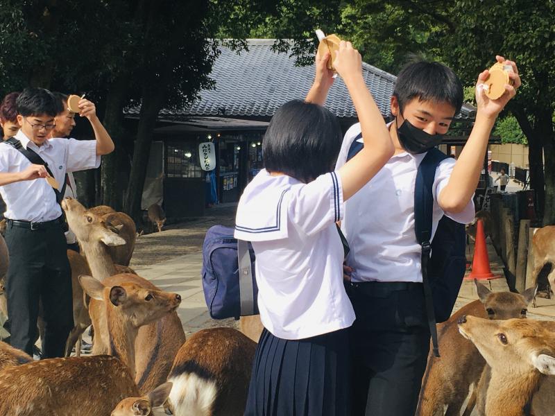 奈良公園では楽しみにしていた鹿せんべい。鹿の総攻撃を受け、歓声と悲鳴が入り混じりました。