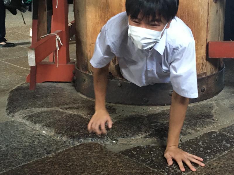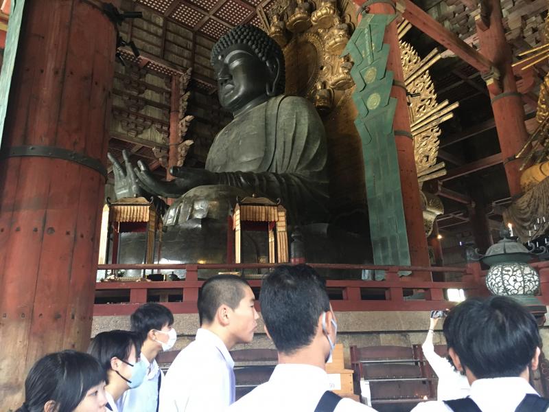 門や東大寺の巨大さにびっくりした後、大仏様の大きさにも驚いた様子でした。思いの外お客さんも多くなく、ゆっくりとガイドさんの話を聞いて回ることができています。鼻の穴くぐりにも挑戦。