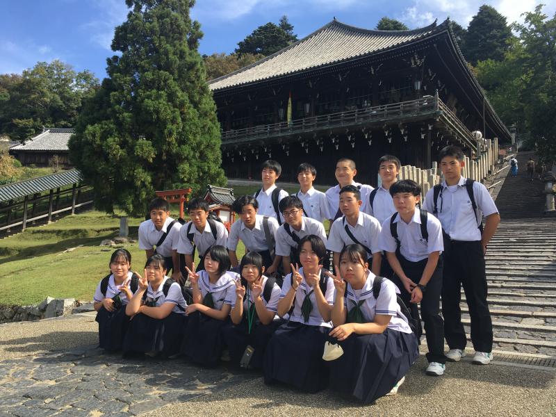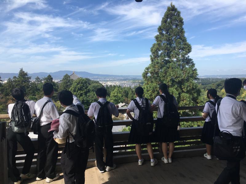 東大寺を後にして、二月堂をバックに集合写真。その後、清水寺のような高い舞台から奈良市を一望しました。