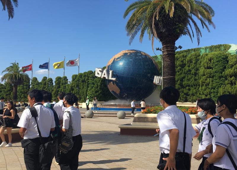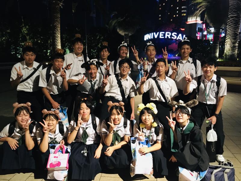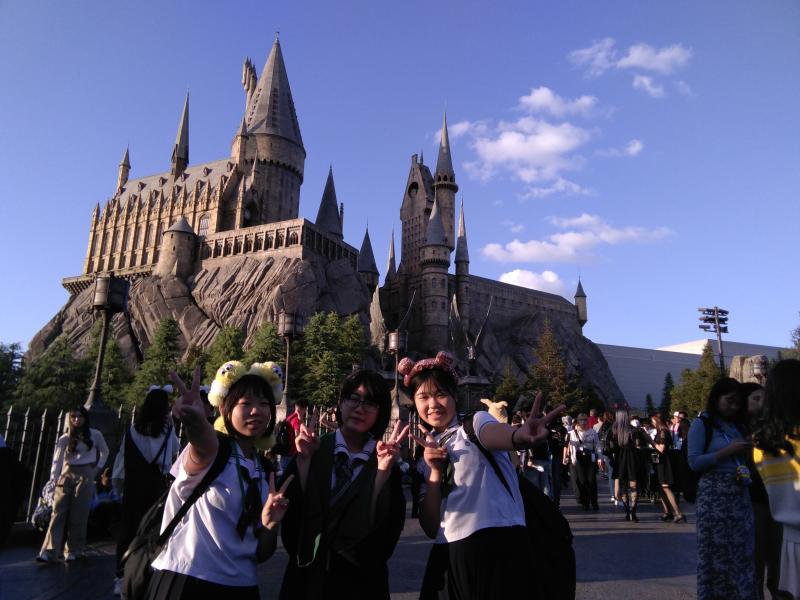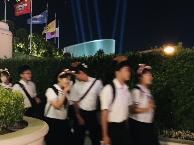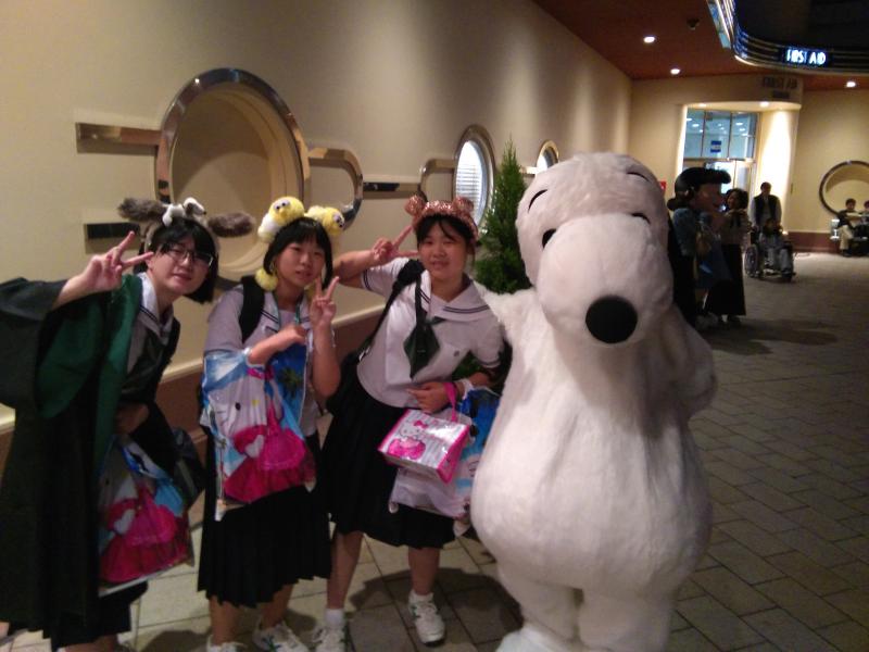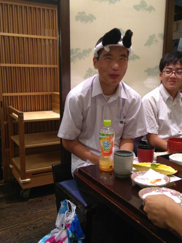 日が暮れてからは流石に肌寒くなりましたが、寒さを訴える生徒はいませんでした。USJから徒歩3分の夕食会場です。耳が生えたままの生徒も。他のお客さんもおいでるので、トーンを下げていますが、まだUSJモードです。