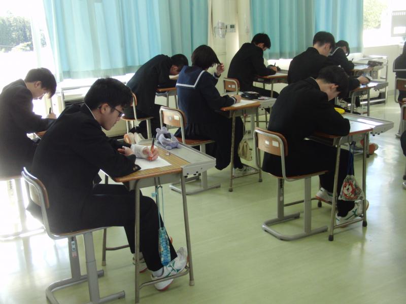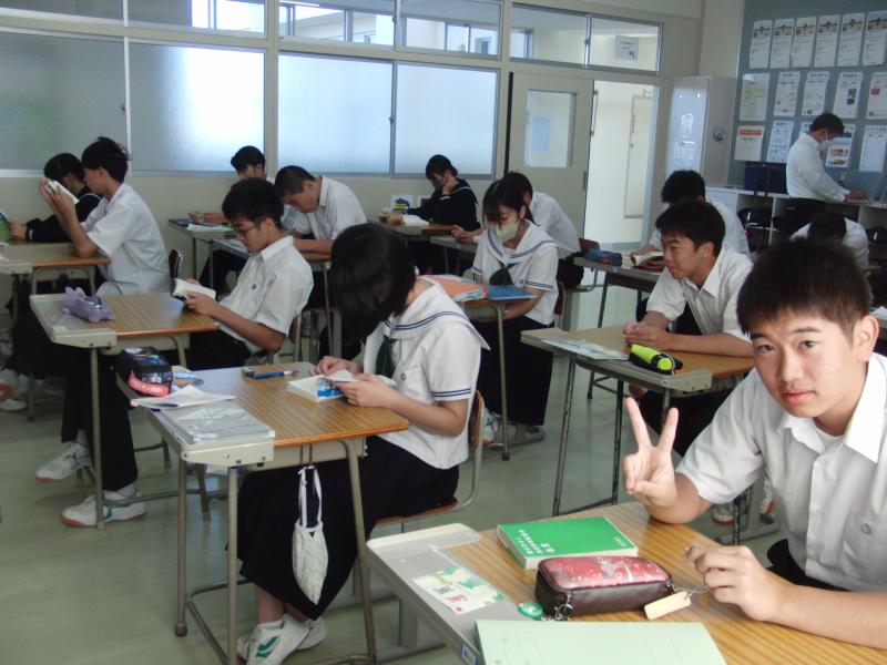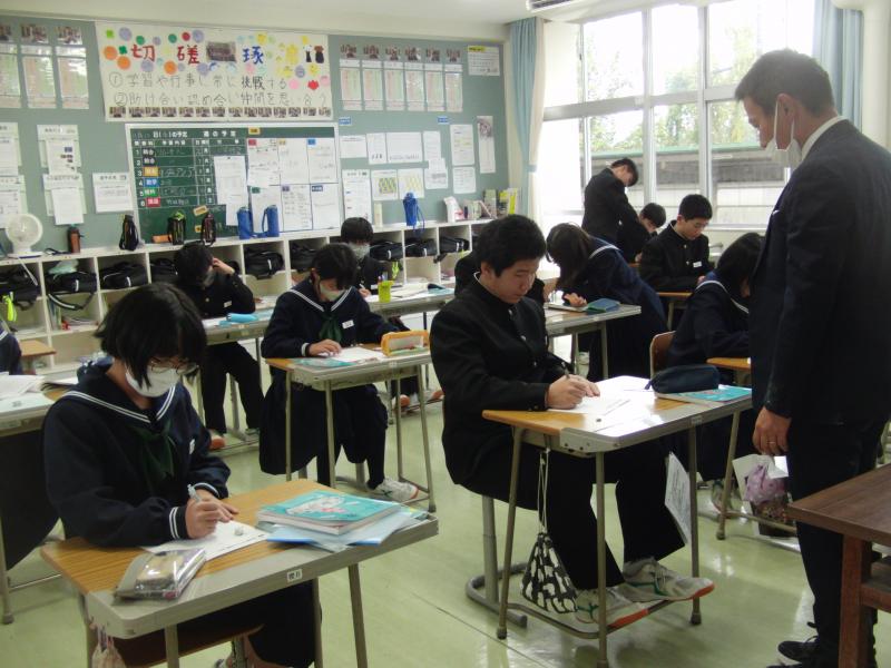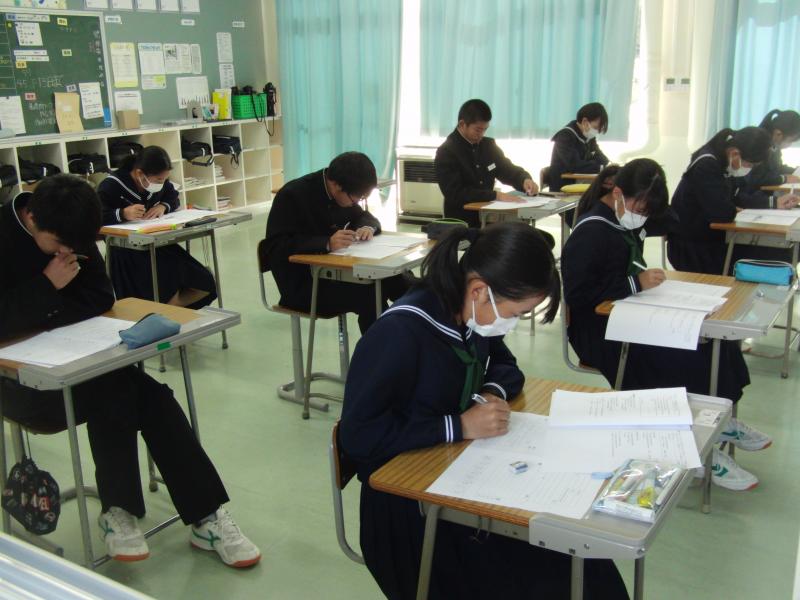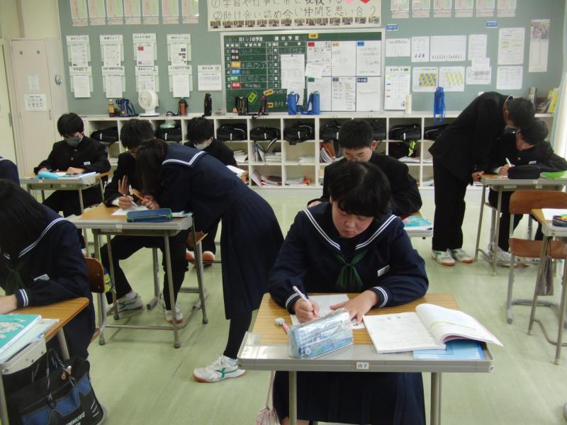 中間テスト二日目。以前より集中する時間が長くなっています。後は、生徒も教員も、貪欲に成績向上を目指す姿勢でしょうか。今日の写真は2・3年生の様子です。