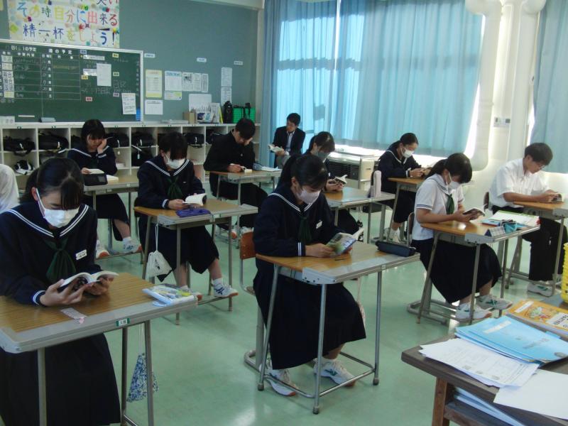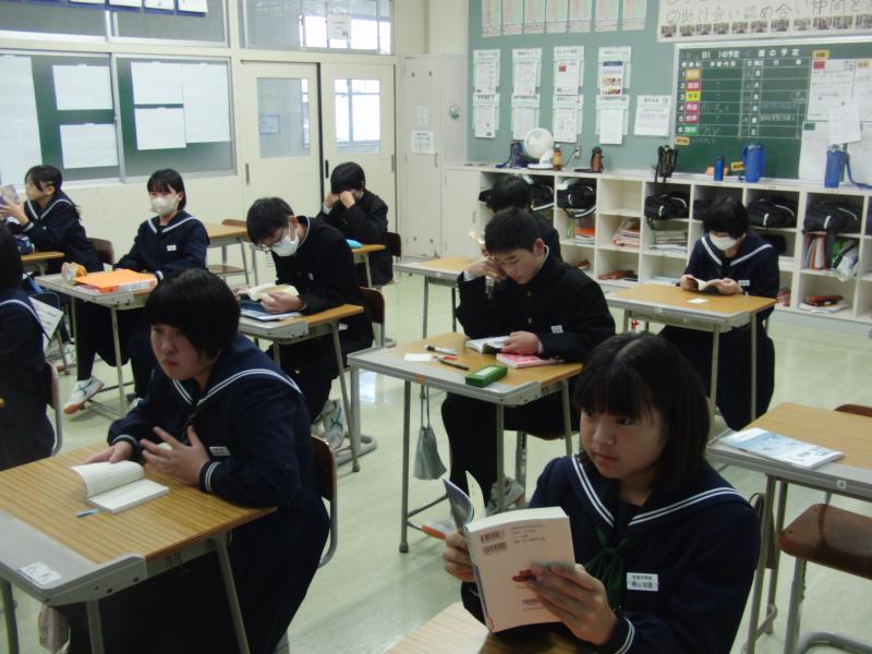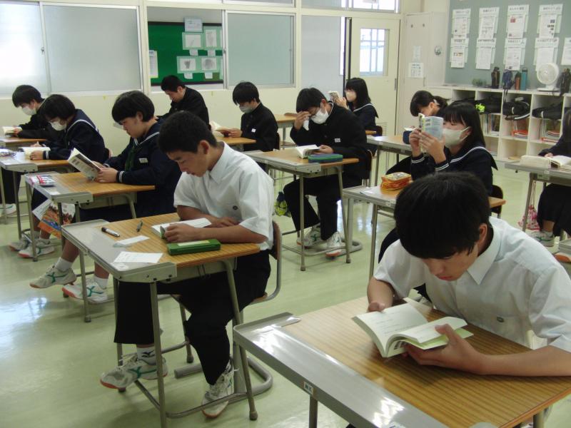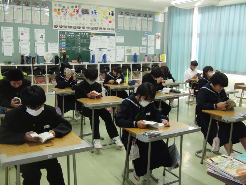 オンラインによる発表や連絡も日常になっています。今日は生徒会の各委員会から取組の重点事項や結果報告がありました。執行部からは、さらに元気な挨拶をしようという投げかけがありました。給食環境委員会からは今月の給食残量調査は全学年ともゼロ、ご褒美?のリクエストメニューの募集についての案内がありました。写真は、1年教室の様子です。移動にかける時間がなく、すぐ朝読書に入りました。
