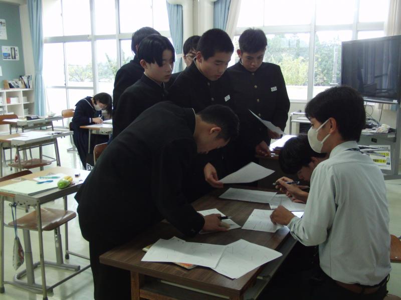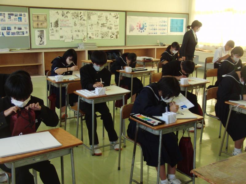 先生方も勉強します。5限目、1年生美術の時間に「身近な人に伝えたいメッセージから文様をデザインし手ぬぐいをつくる」ために、文様の配列を考えました。おうちの方や友達に対して感謝の気持ちや励ましの気持ちをデザインで表現していきます。友達の作品(製作途中)を見て、なるほどとうならせるアドバイスをする生徒たちも多数。1年生のポテンシャルを感じさせる1時間でした。先生方の反省会では、生徒の力をもっと伸ばすための方策を話し合いました。
