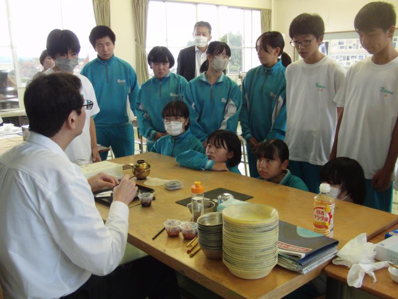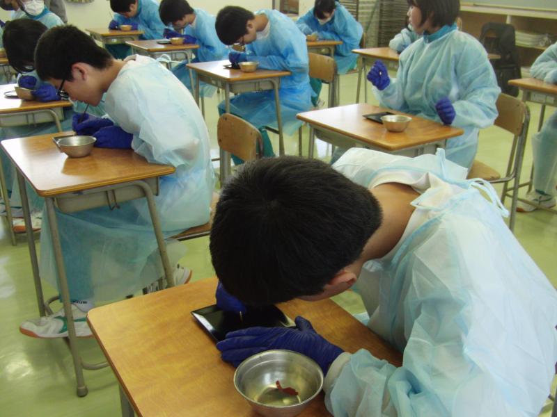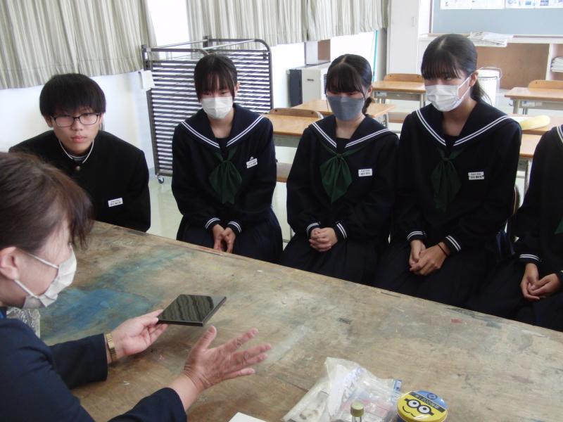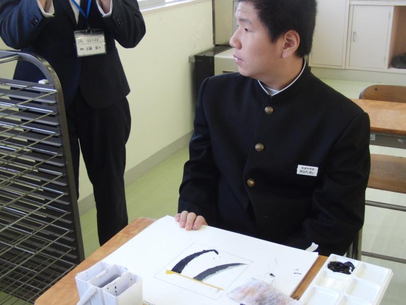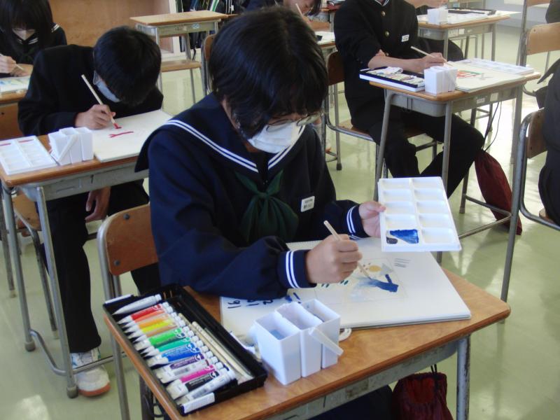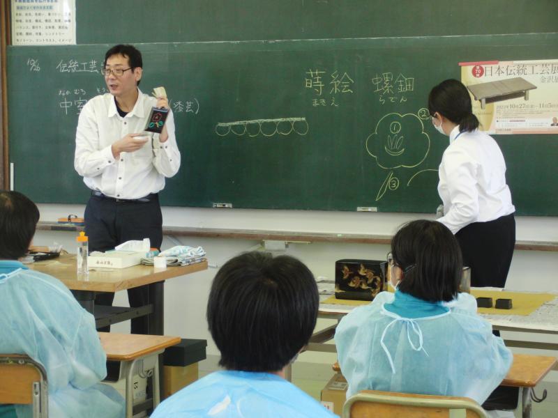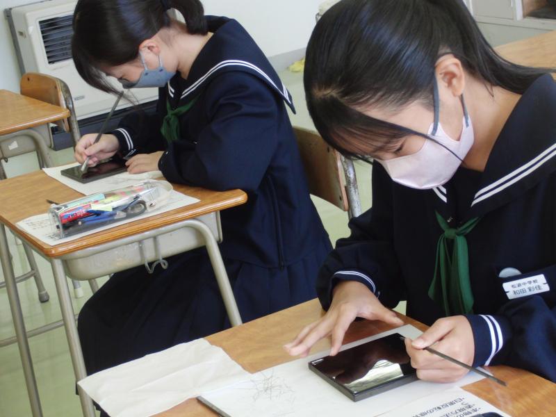 明日から県立美術館で開催される「第70回日本伝統工芸展金沢展」の関連事業「伝統工芸こども鑑賞コース」を1年生を対象に実施しました。当該展に出品されている中室惣一郎さん(輪島市在住、漆芸工芸員)を講師にお招きし、輪島塗蒔絵の実演と鑑賞です。実際に道具や材料にも触れさせていただき、中室さんの軽妙なトークに1年生たちの好奇心も加わって、「ほんもの」に直にふれた学びの多い時間でした。今回はスペシャルで、漆を使った蒔絵体験もセットにしていただき、生徒たちは濃い2時間を過ごしました。