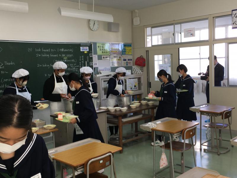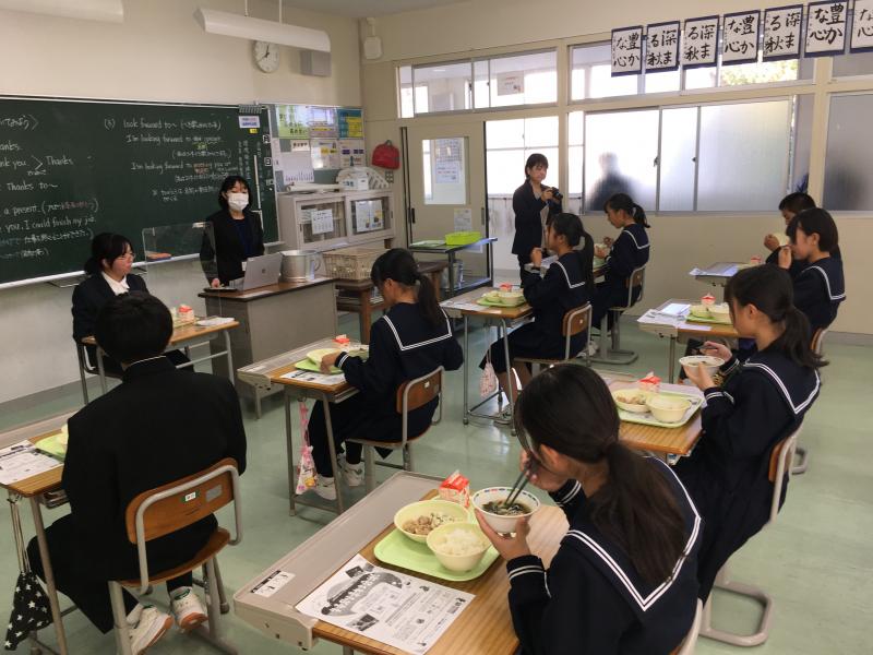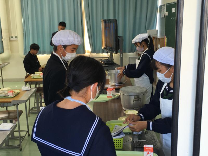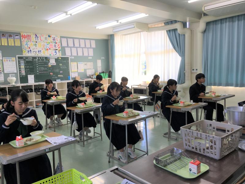 校区の農家さんから、特別栽培米3tが能登町の小中学校へご寄付されました。松波小中学校へは、そのうち510㎏届いています。本日は、特別栽培米を主食に、生姜焼きとサラダ、お味噌汁というメニューです。合唱のあと栄養教諭から特別栽培米の説明をしビデオを視聴しました。ご寄付者を案内していただいた能登町教育長から、生産者のお気持ちを代弁してお話しいただき、生徒たちもほっこりした表情で、特別栽培米給食を美味しくいただきました。