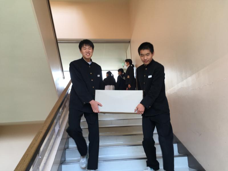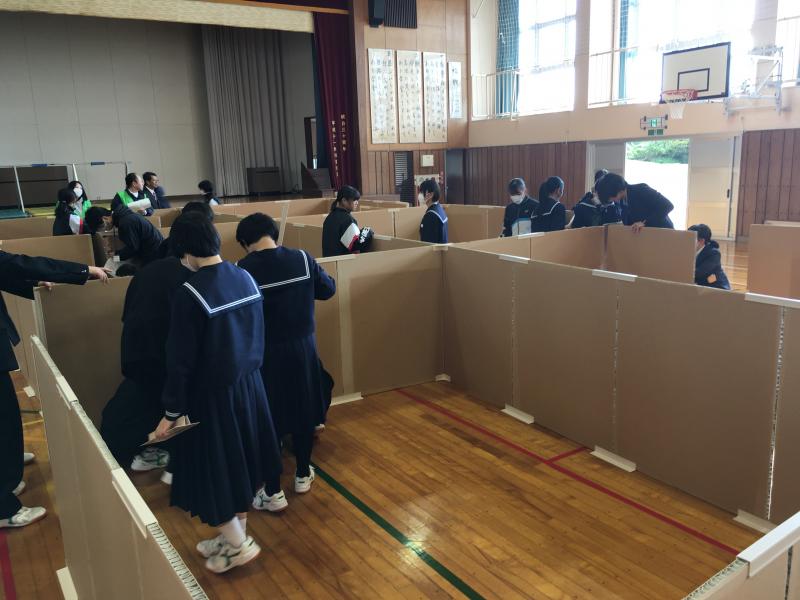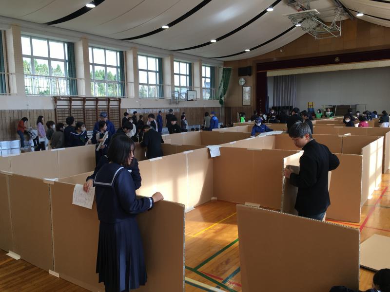 松中生徒は、一時避難の後、松小へ二次避難をしました。そこでは、避難所の間仕切り設営を一任され、まずは3階倉庫から体育館へ資材運び。その後、3年生と1・2年生のグループに分かれてそれぞれ間仕切りを完成させました。1・2年生がうまく作るのをみてあわてた3年生はピッチアップ。完成はほぼ同時でした。